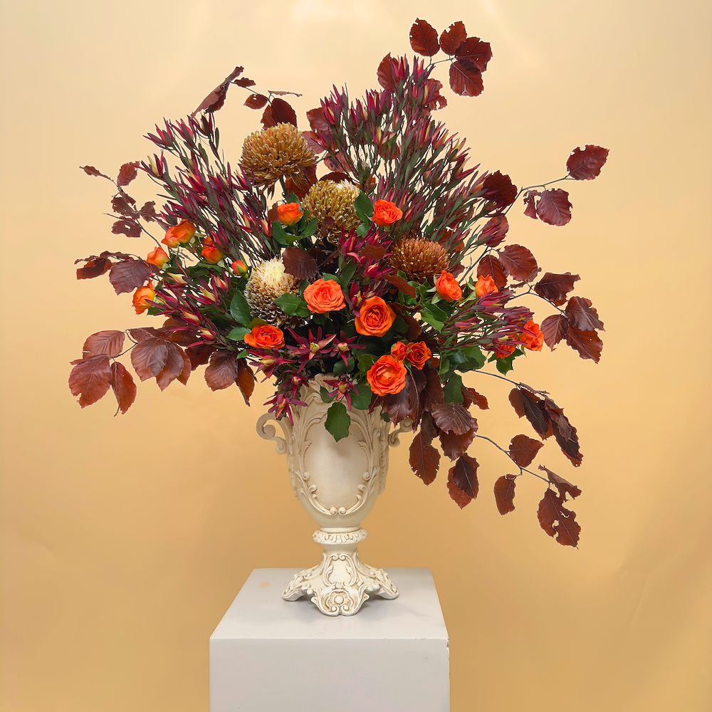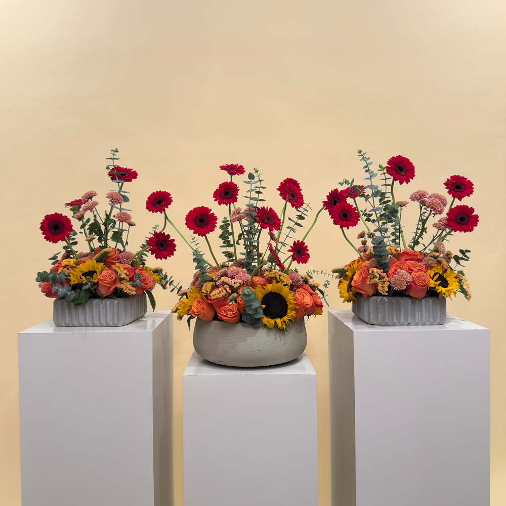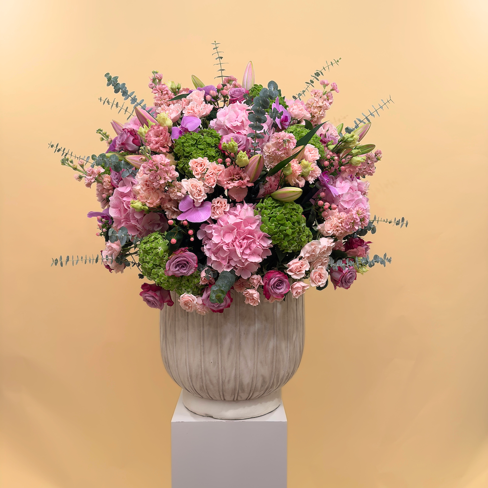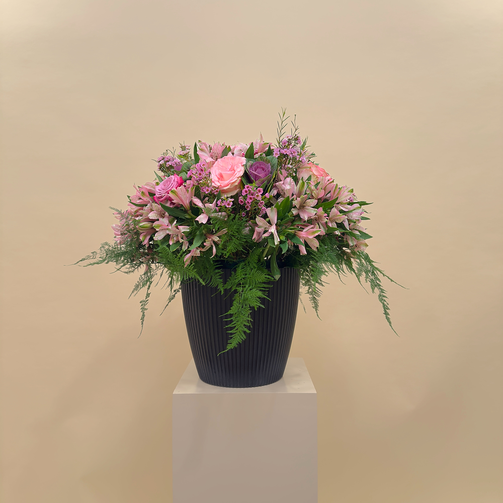 Fuchsia orchid plants arranged in a black dotted ceramic pot with echeveria.