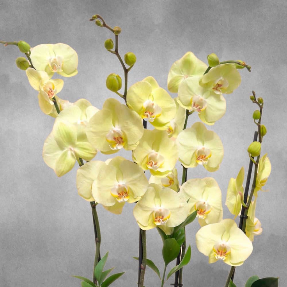 A ceramic vase beautifully arranged with golden phalaenopsis orchid plants.