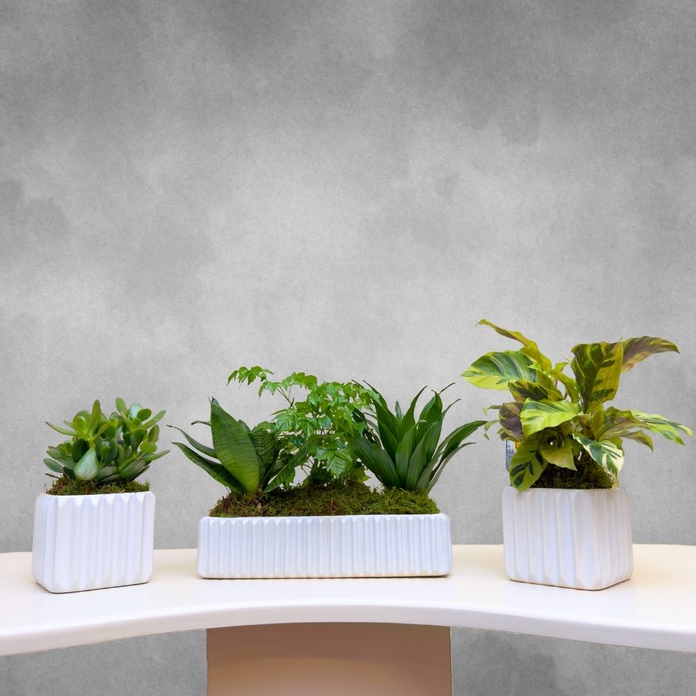 Set of green plants, in a ceramic pot, yellow calathea, crassula sunset, dracaena compacta, sanseveria hahnii and radermakera sinica.