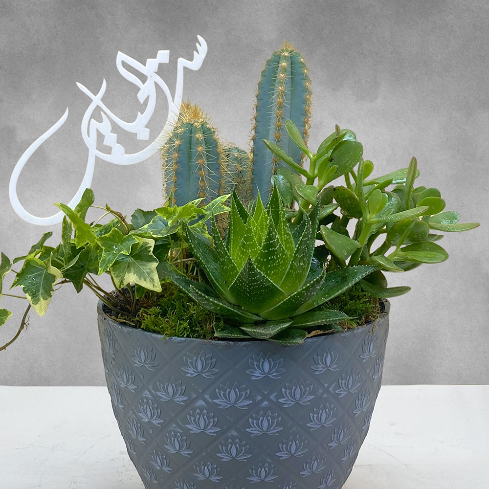 A bouquet containing pilocereus, ivy, aloe, and crassula plants, arranged beautifully in a grey pot.