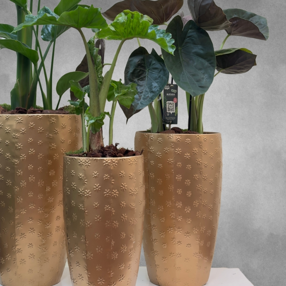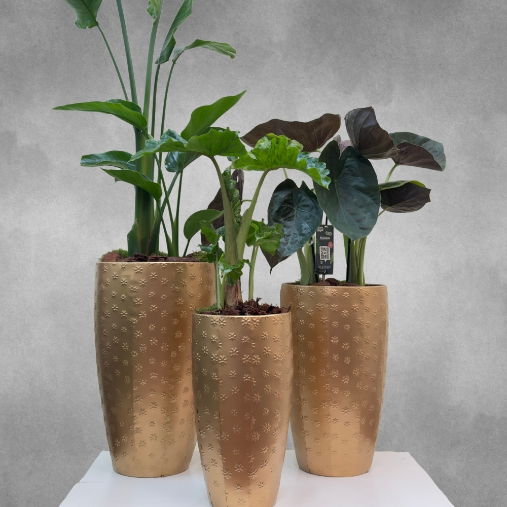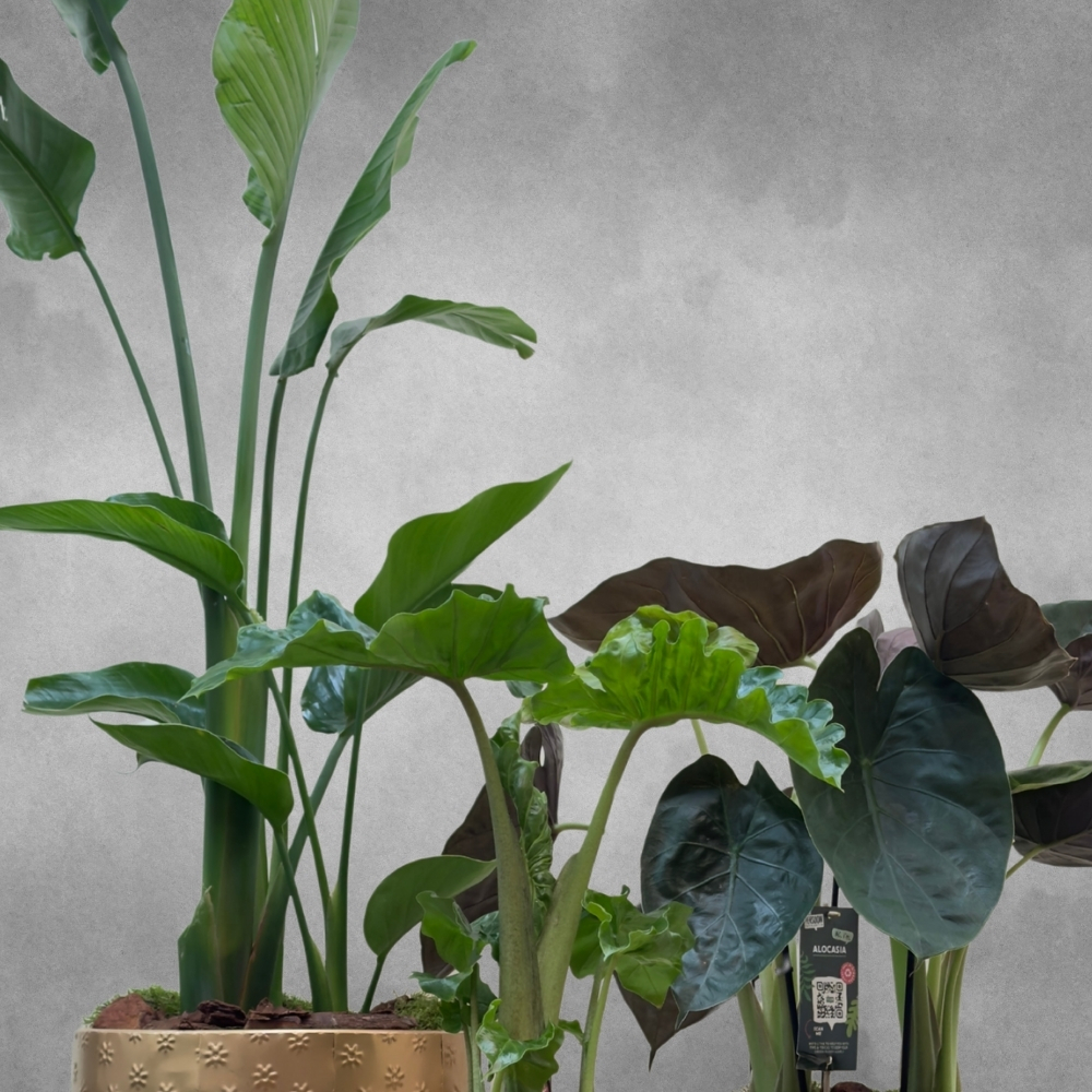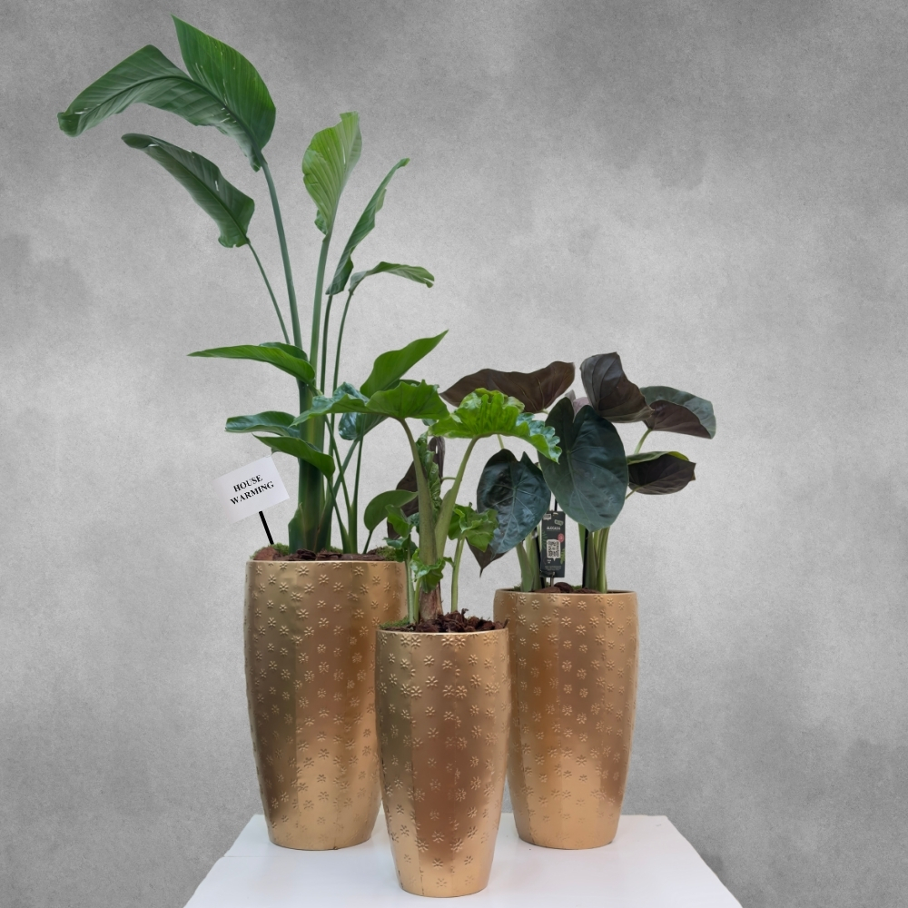 A set of 3 plants: strelitzia nicolai, alocasia low rider, and alocasia wentii, arranged beautifully in a golden pot. A striking and elegant display, perfect for brightening any space.