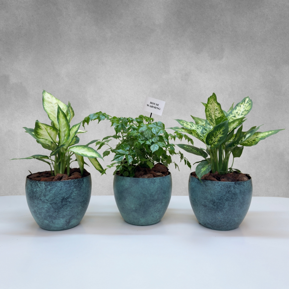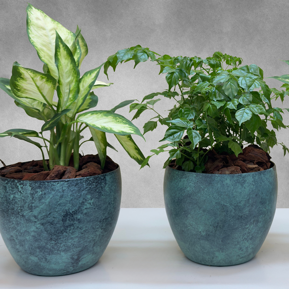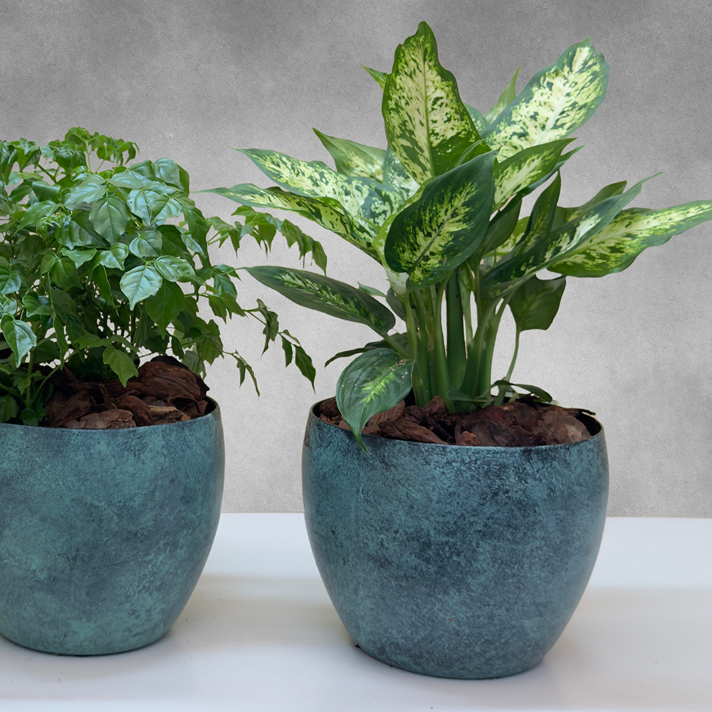 Set of dieffenbachia, raderma sinica, planted in a tin green pot.