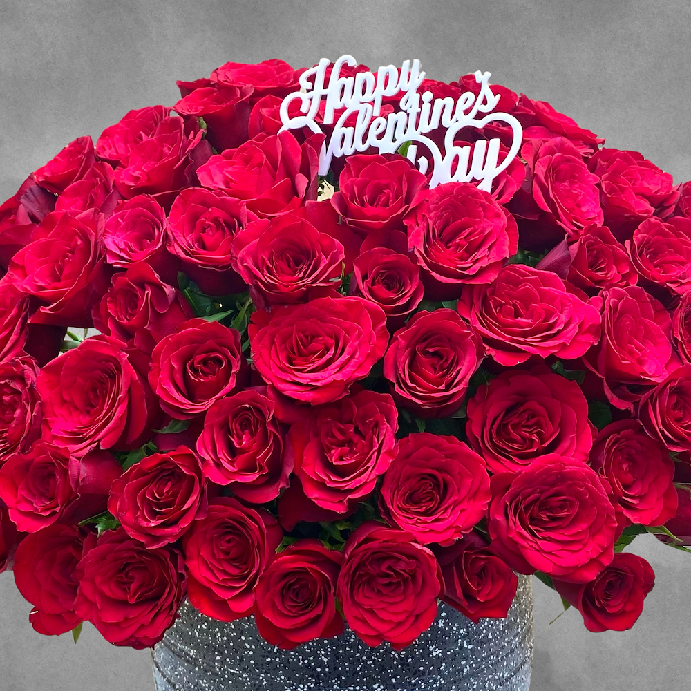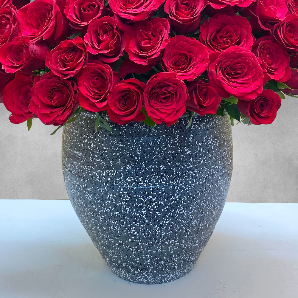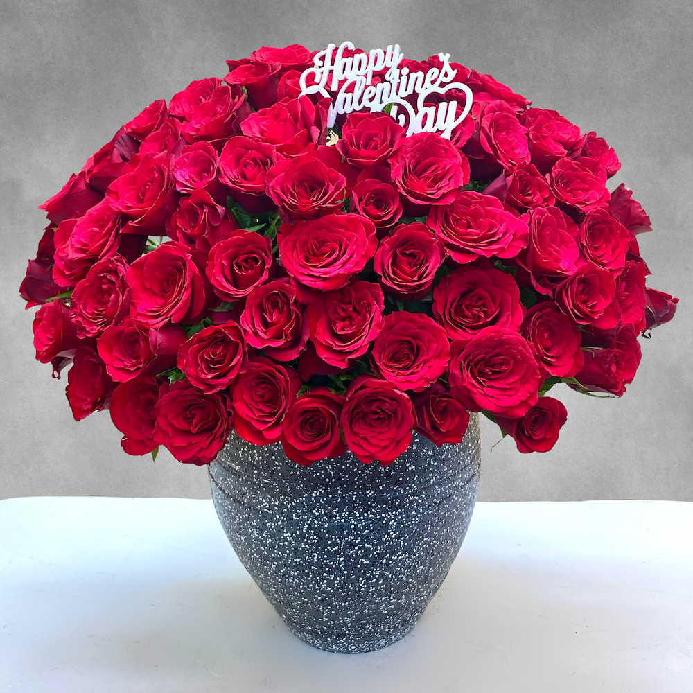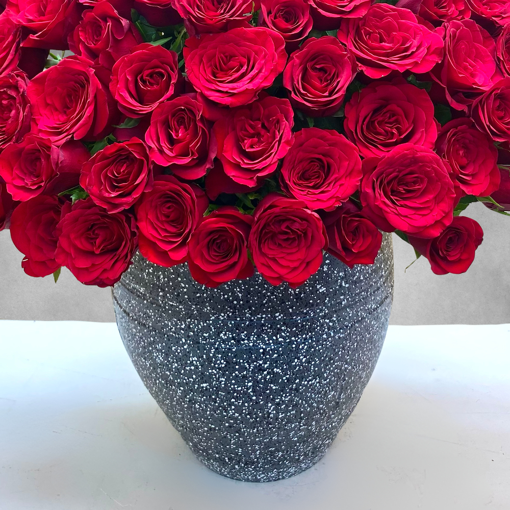 A bouquet containing roses and baby roses, arranged beautifully in a vase.