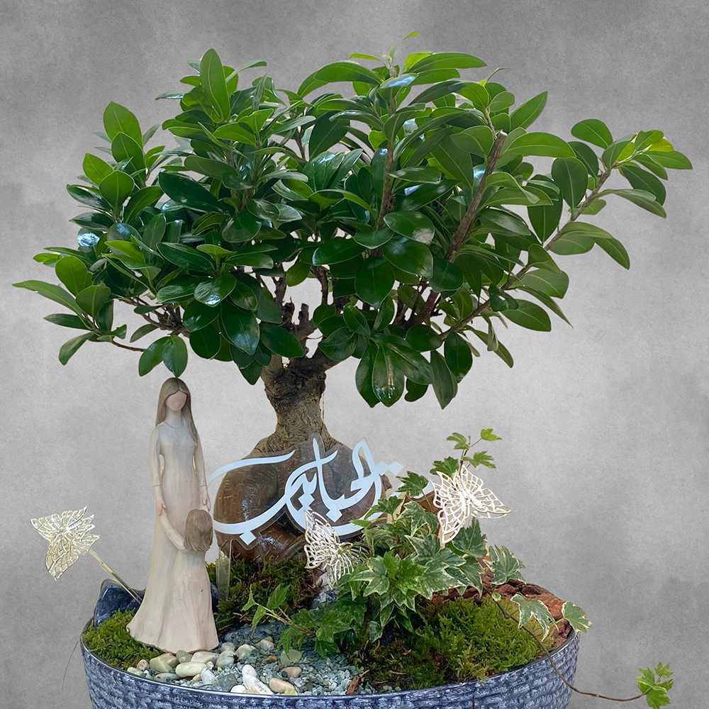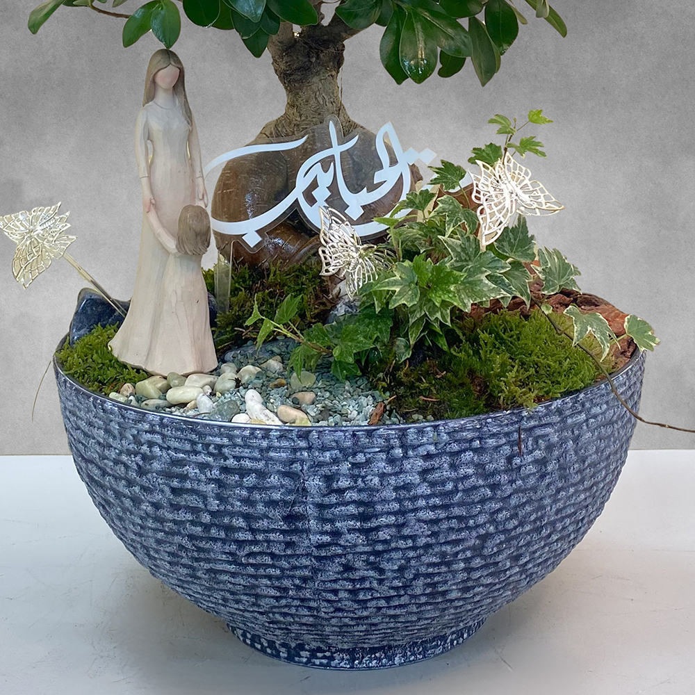 A grey owl pot arranged with ficus bonsai and ivy plants.