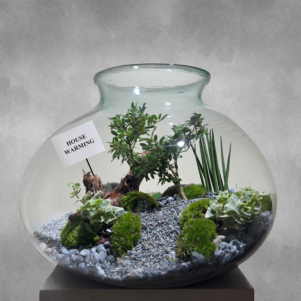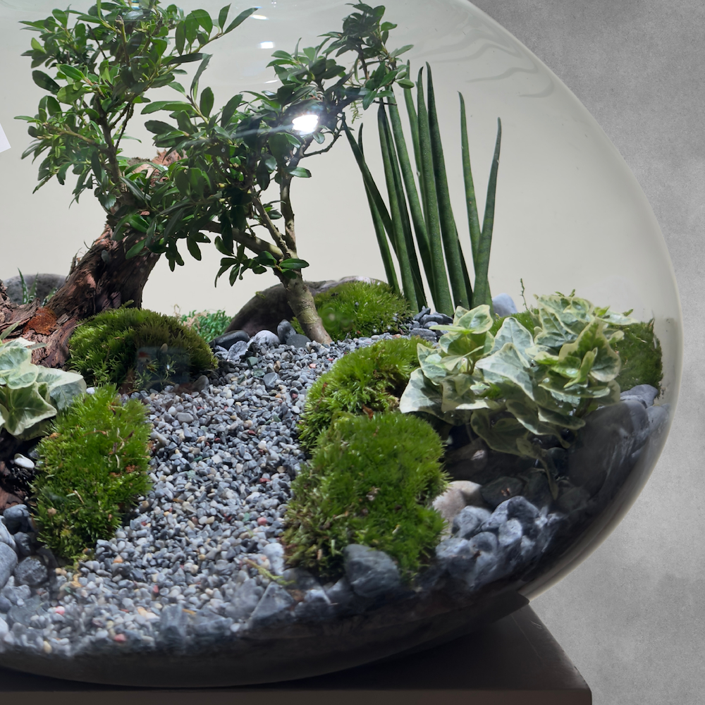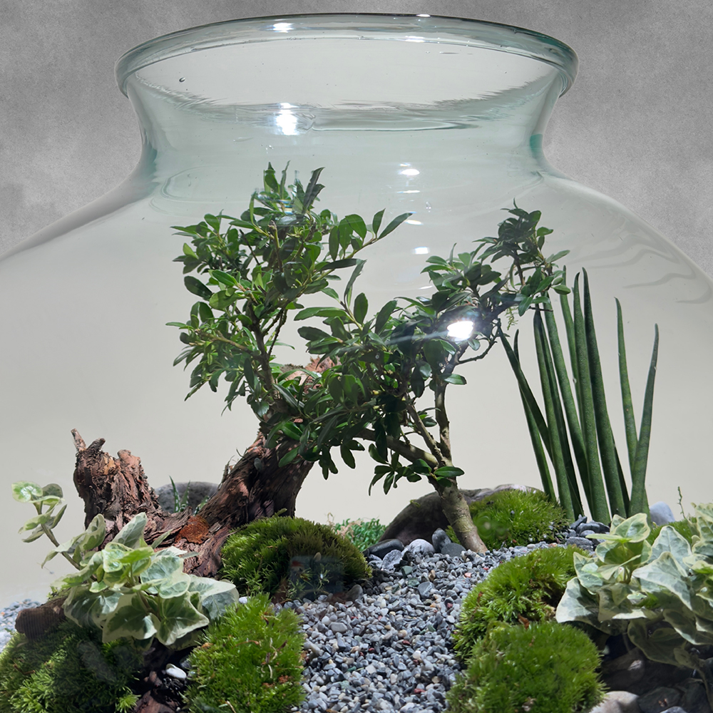 An ilex bonsai plant, beautifully displayed in a terrarium glass. A refined and natural arrangement, perfect for adding a serene, modern touch to any space.