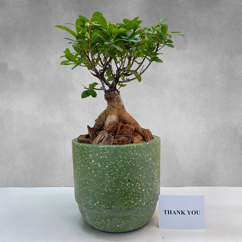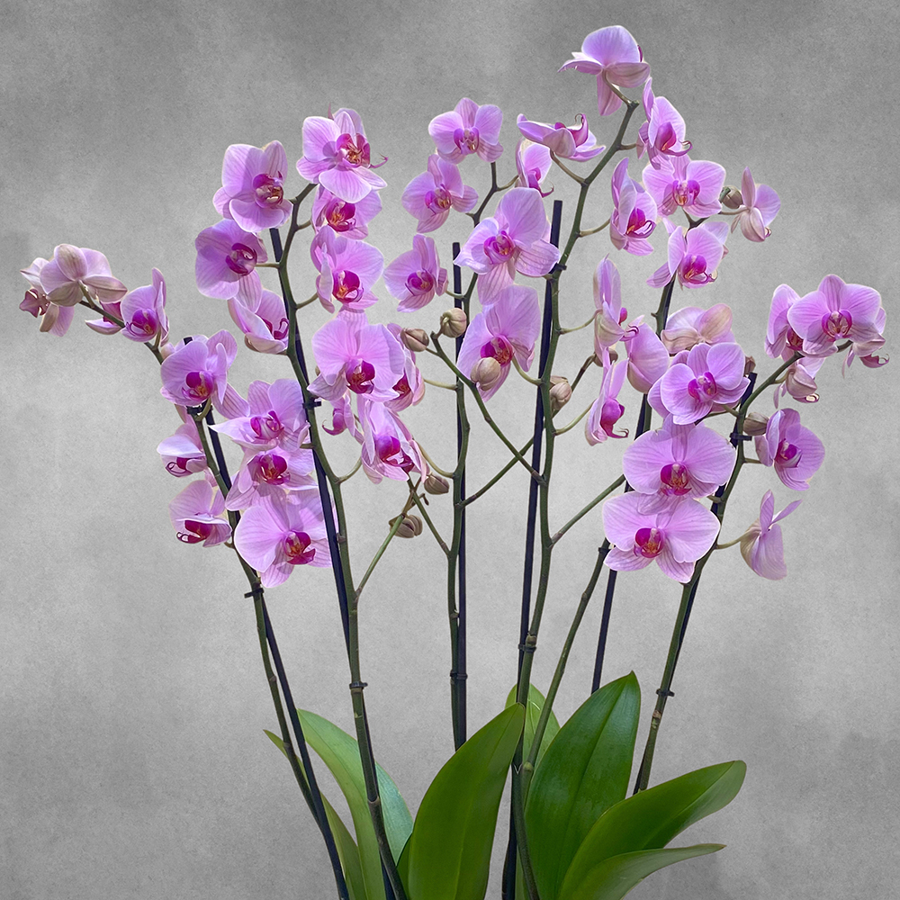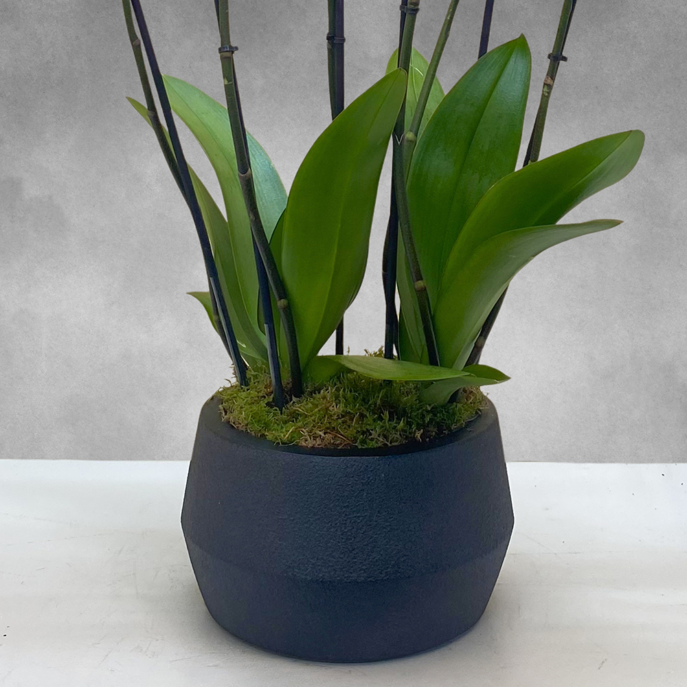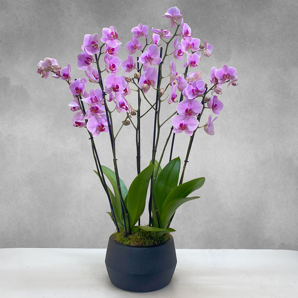 Washinton pink orchid in a black ceramic pot.