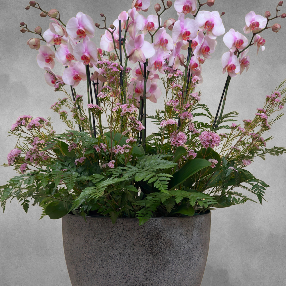 Light pink orchid plants with wax flowers and leather leaves, arranged beautifully in a grey terrazzo pot.