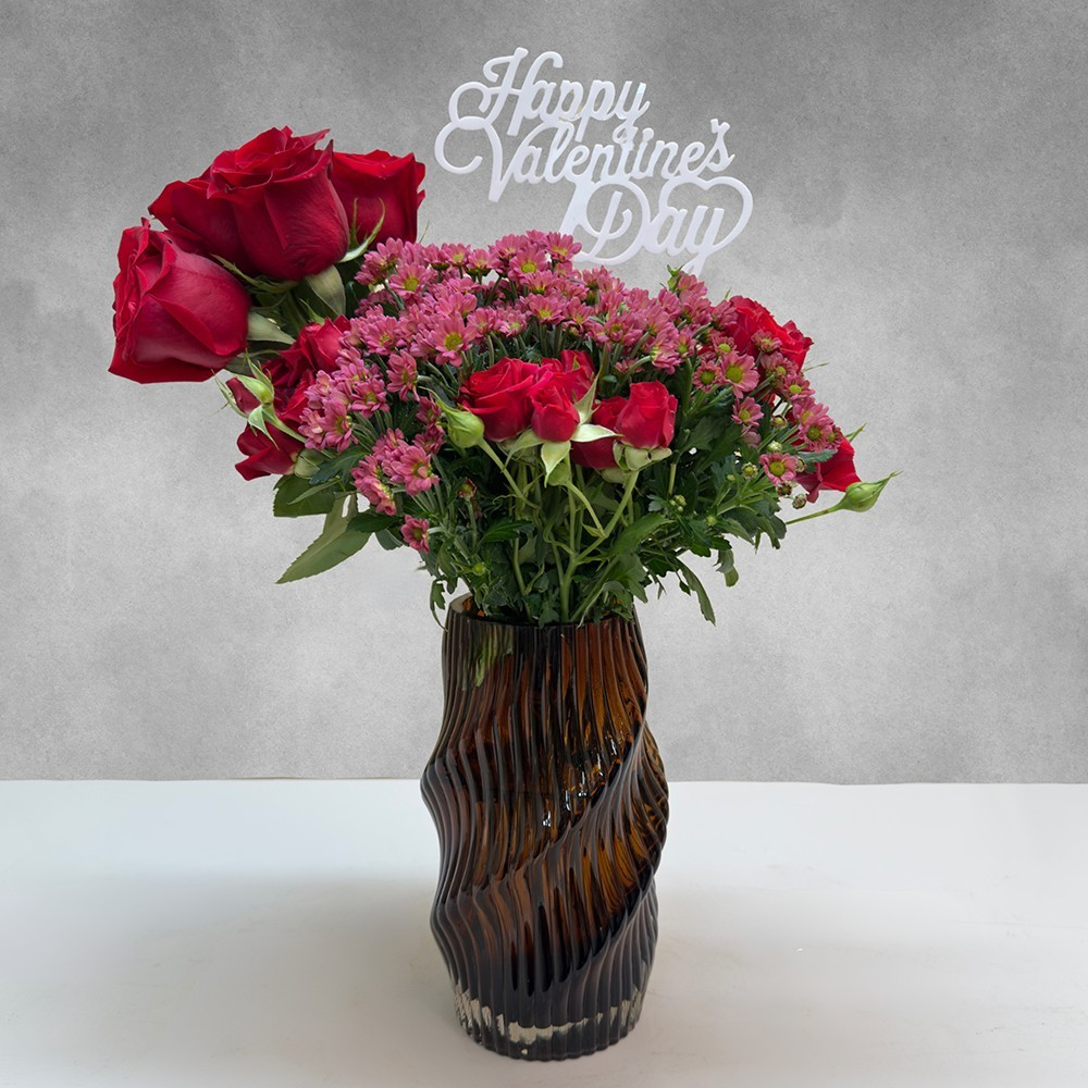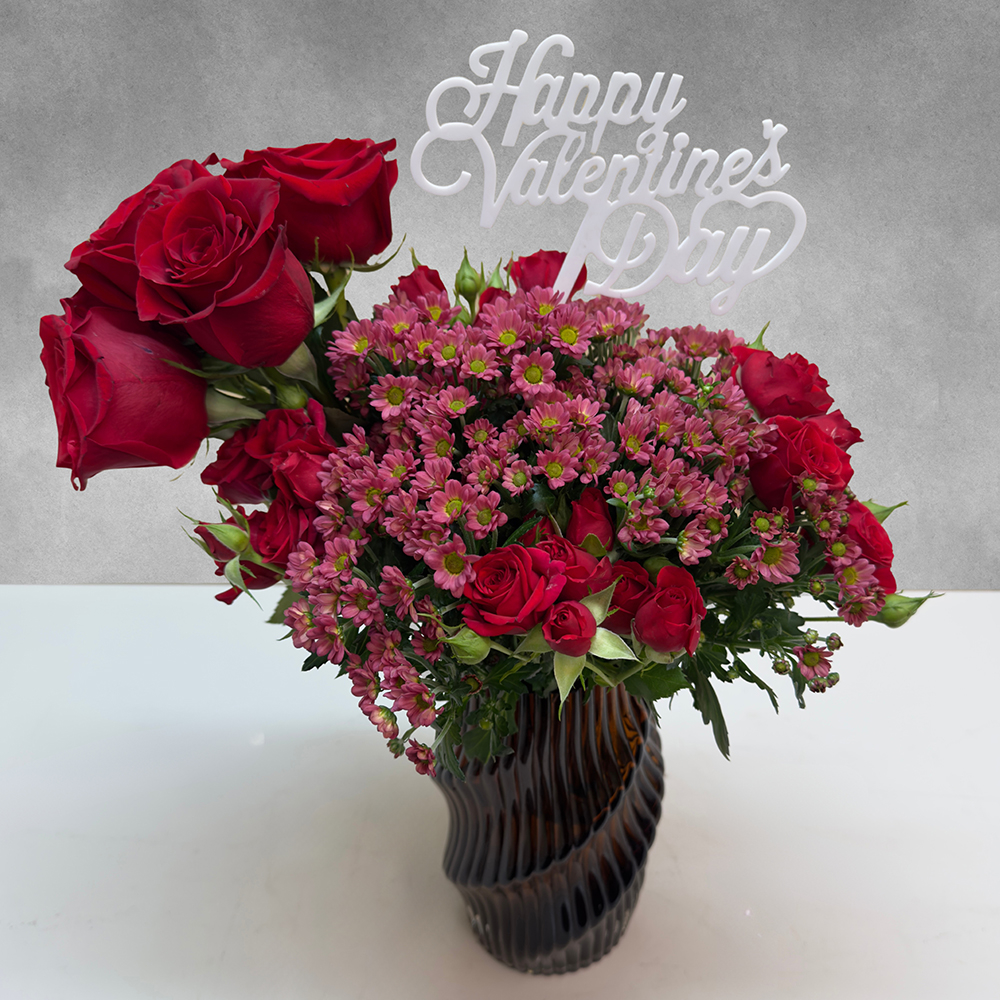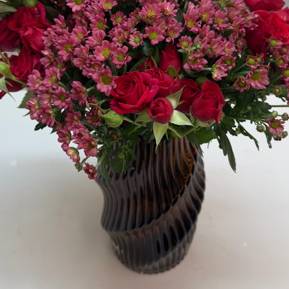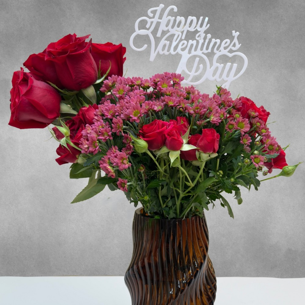 Red roses and pink chrysanthemums, beautifully arranged in a vase. A classic and elegant display, perfect for brightening any space or occasion.