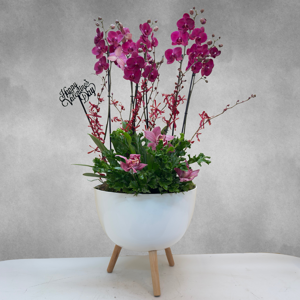 A planter featuring montreux orchid plants, mokara and cymbidium flowers.