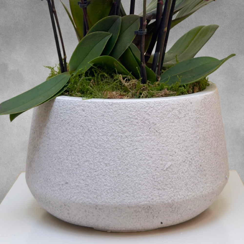 Red narbonne and mini orchid plants, arranged in an off-white ceramic pot.