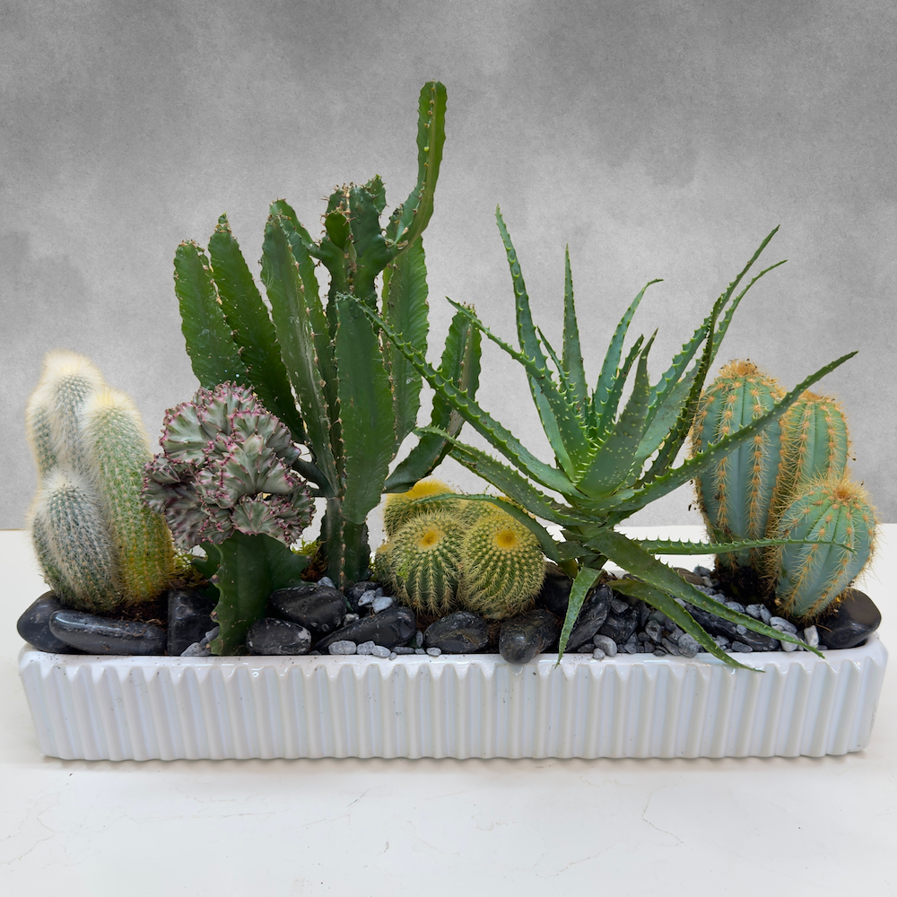 Pilocereus, cactus warasi, aloe aborcens, euphorbia lactae filled in a rectangular white ceramic vase.