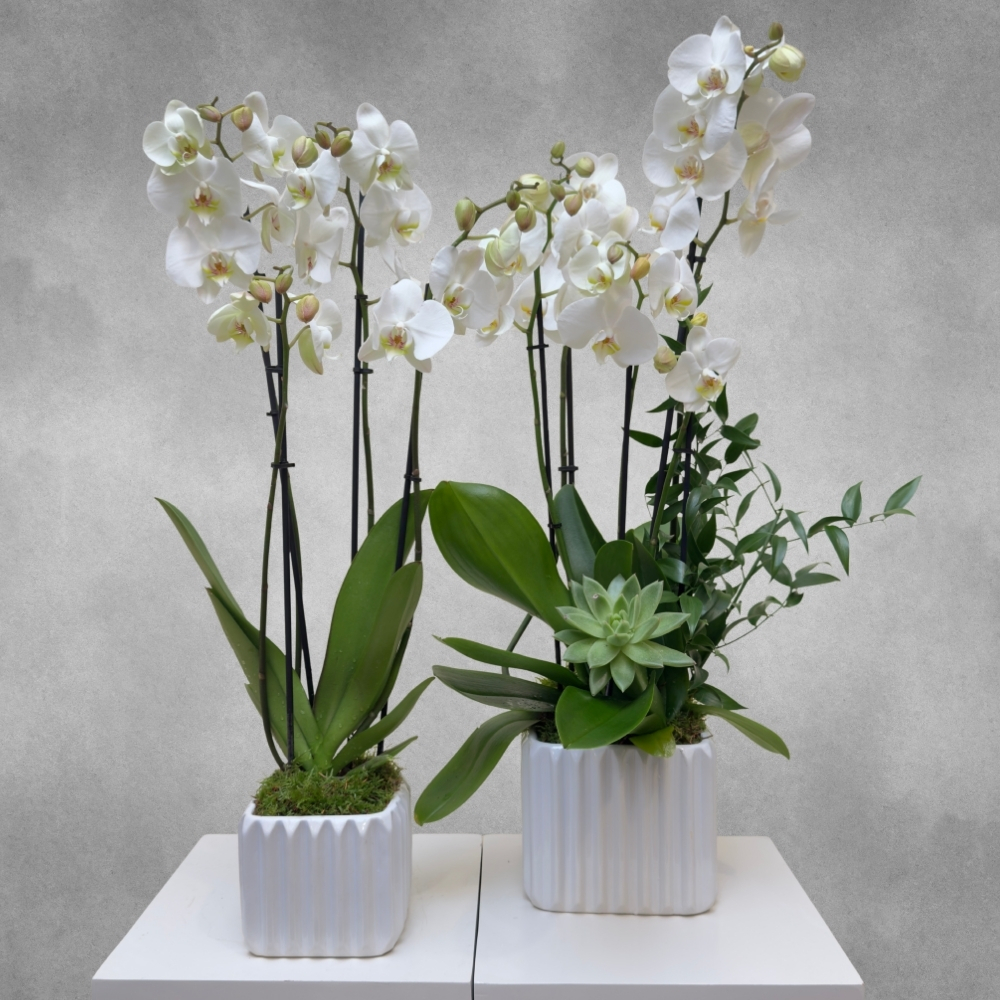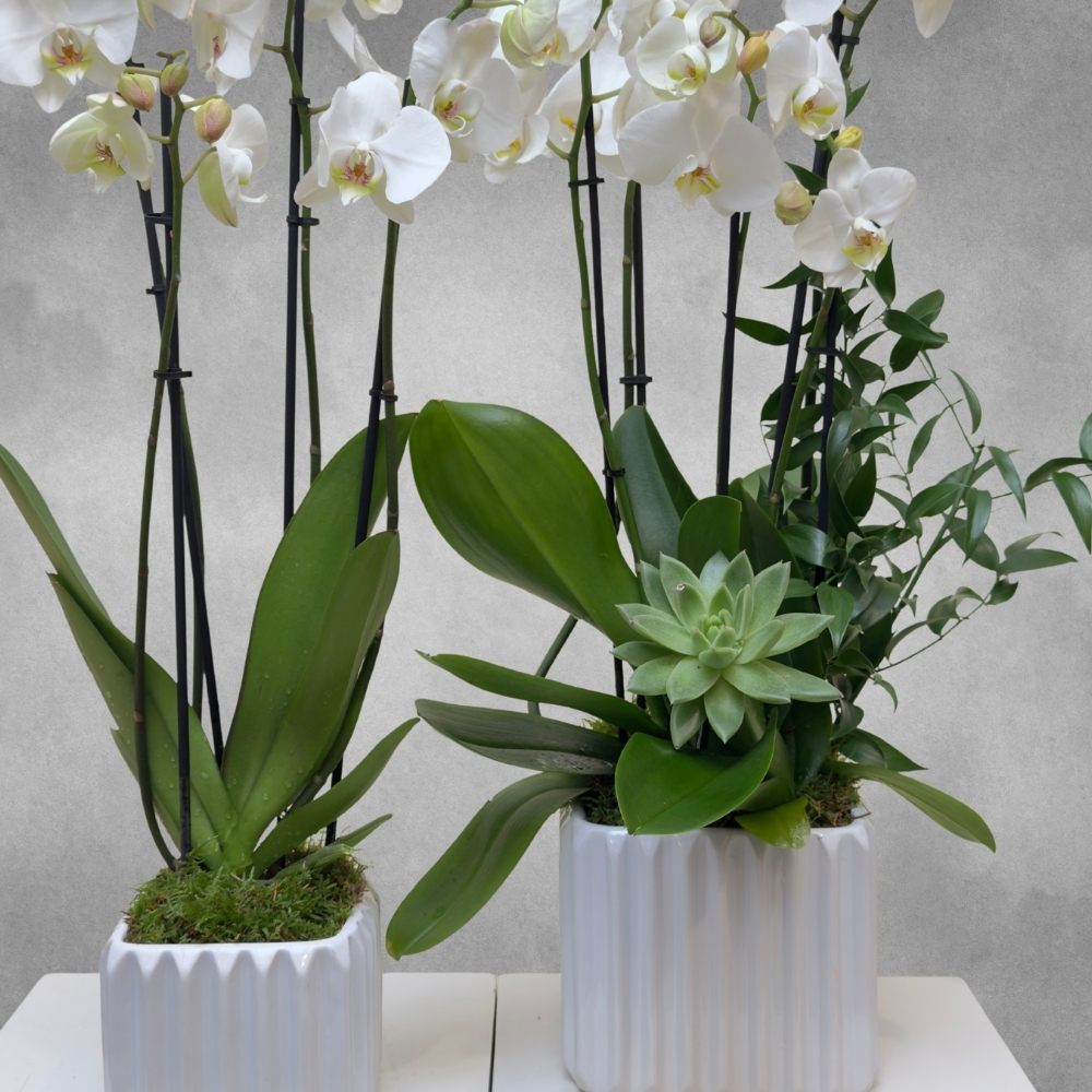 2 ceramic vases filled with white orchid plants, echeveria plant and ruscus leaves.