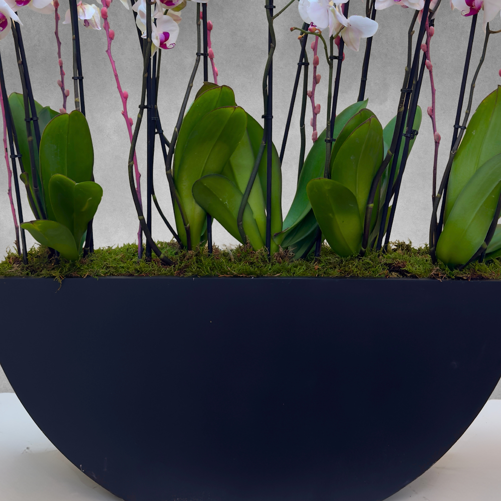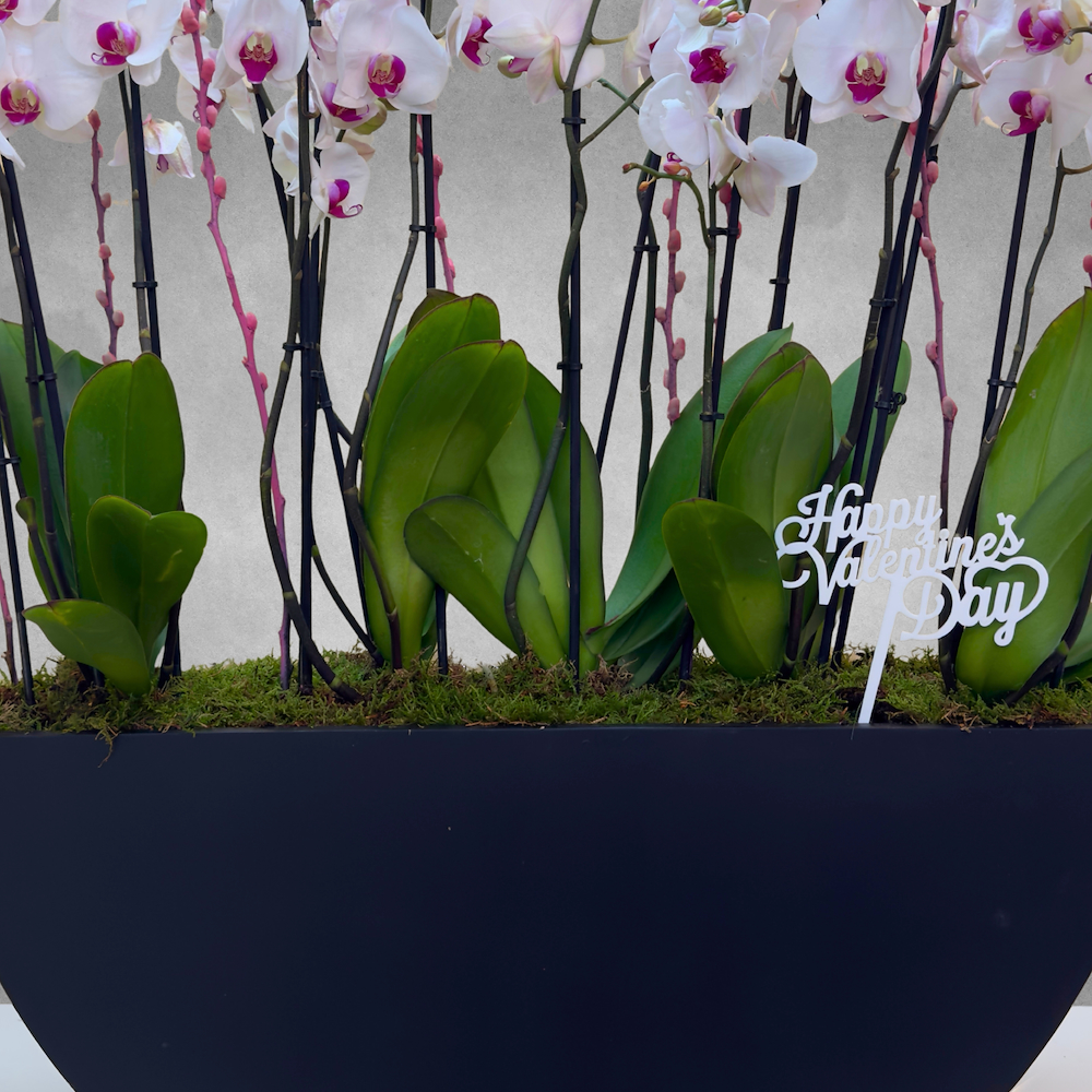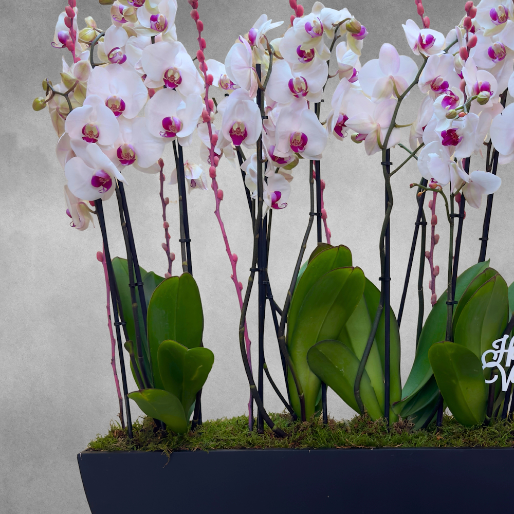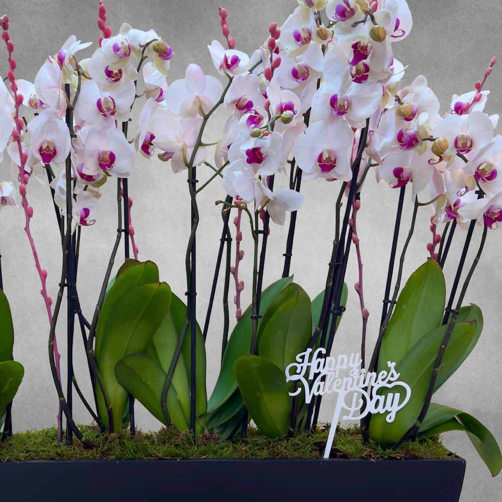 A bouquet containing red lip orchid plants, arranged beautifully in a luxurious vase.