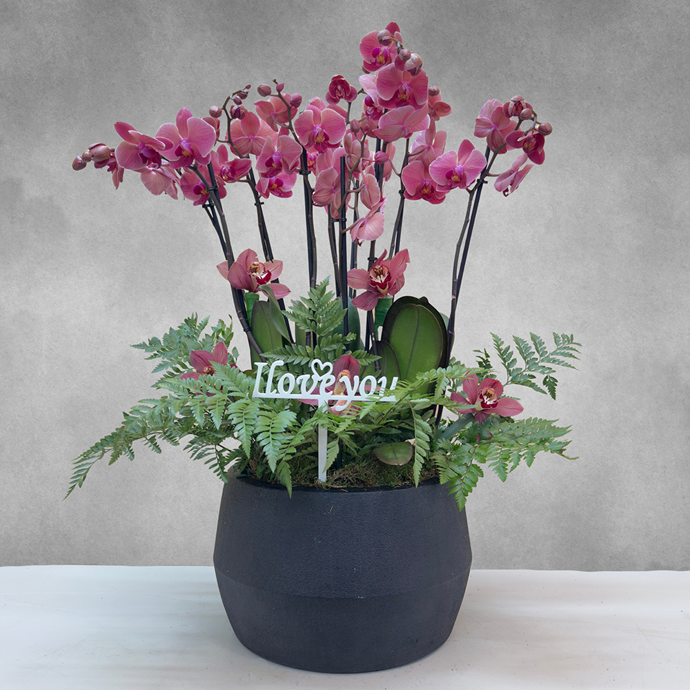 Narbonnes red orchid plants in a black ceramic pot with cymbidium petals.