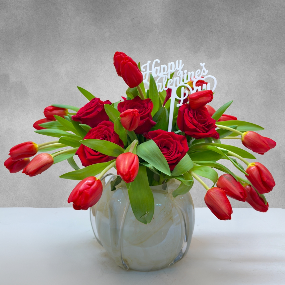 Marble designed glass vase decorated with red tulips and roses.
