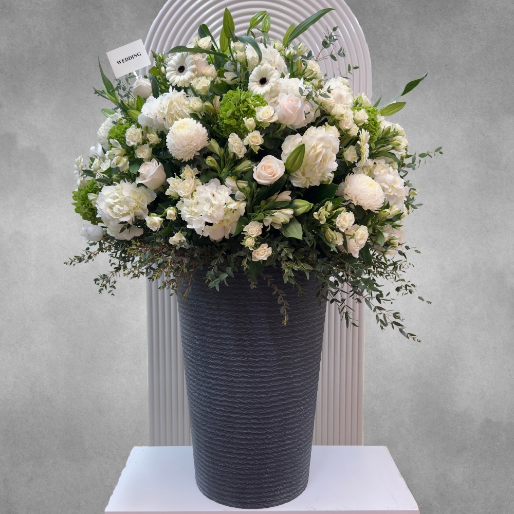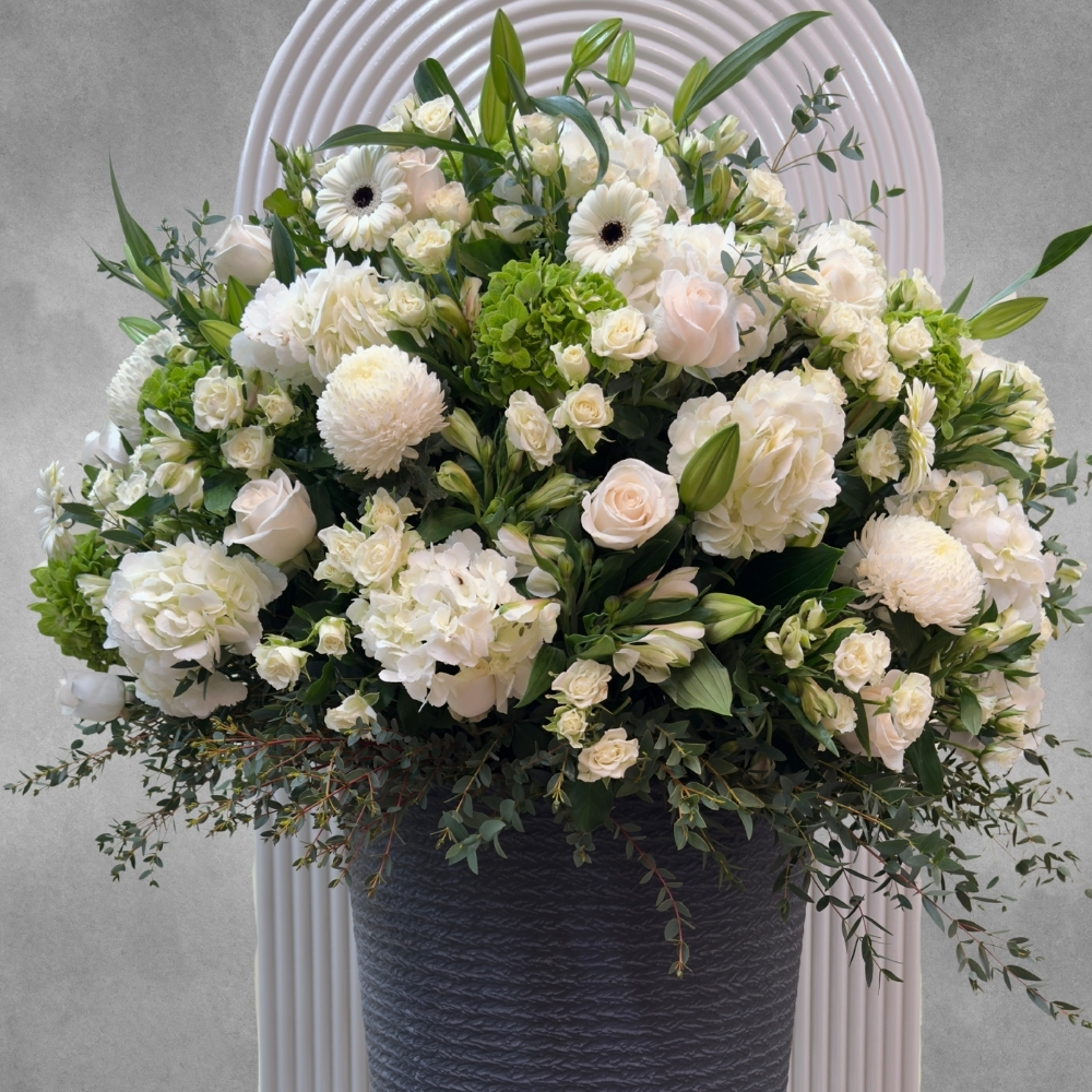 A bouquet containing roses, baby roses, hydrangeas, gerberas, chrysanthemums, and alstroemerias, arranged in a black fiber pot.