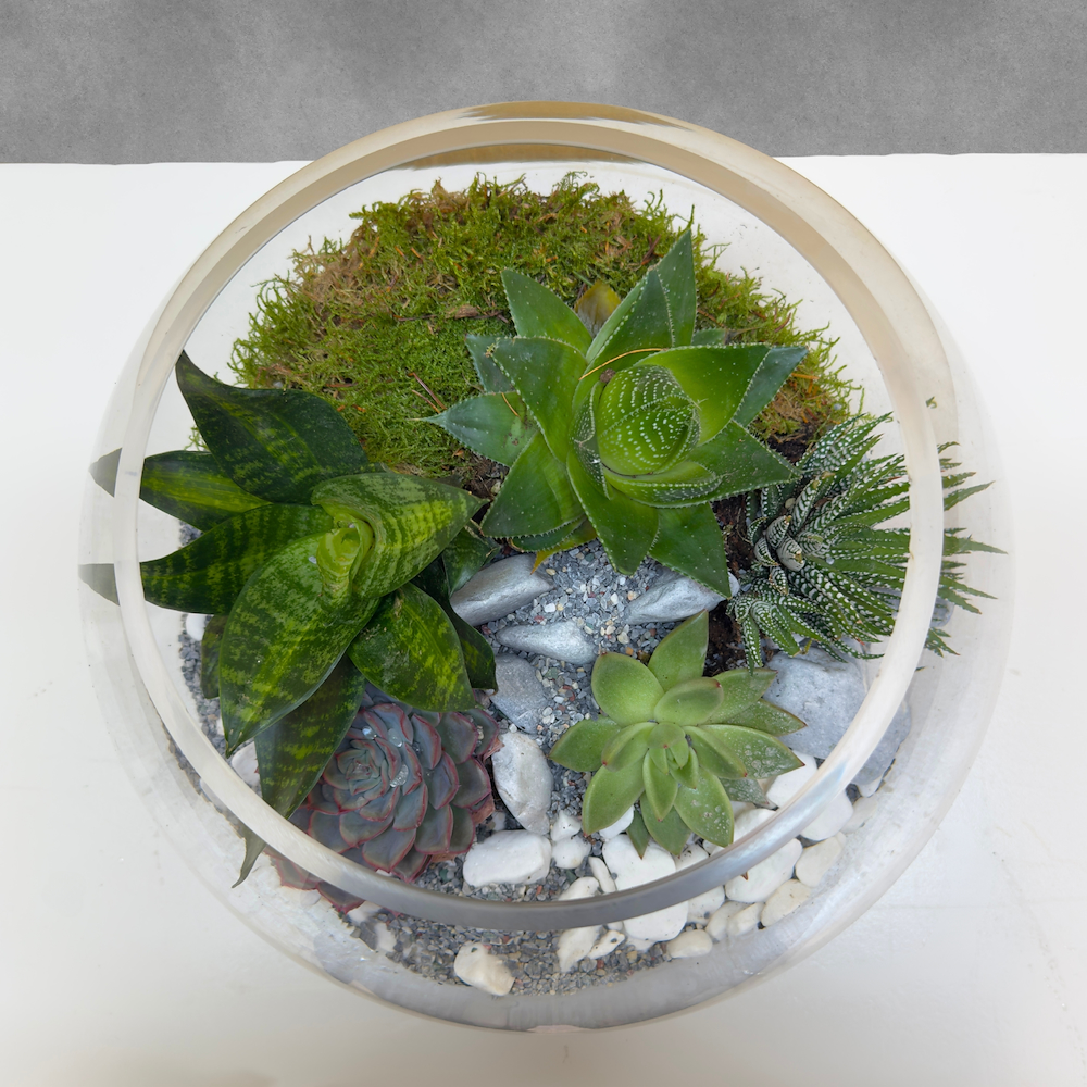 Succulent plants in a ball-shaped glass vase.