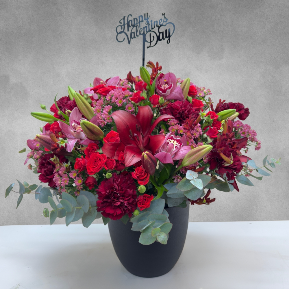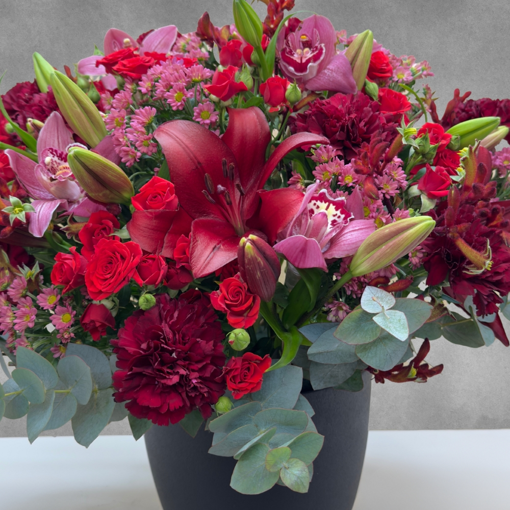 A bouquet containing baby roses, lilies, cymbidiums, chrysanthemums, carnations, and anizoganthos, arranged beautifully in a black vase.
