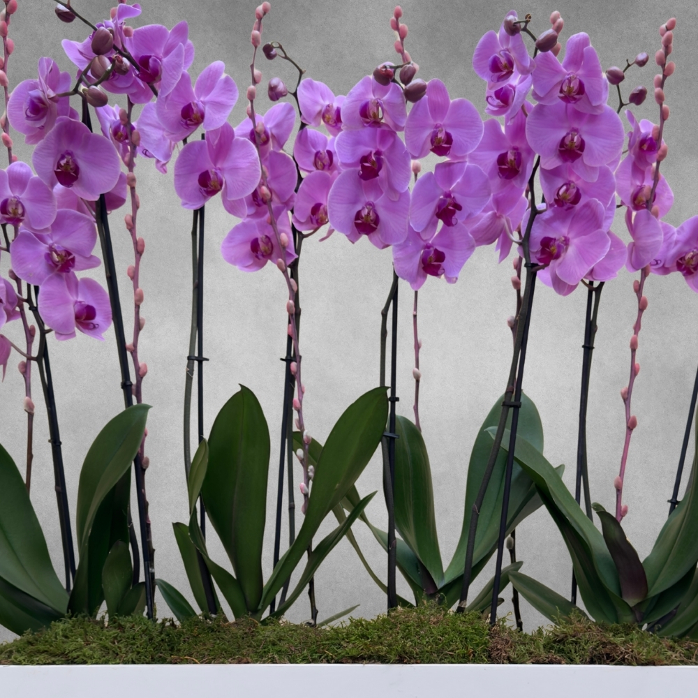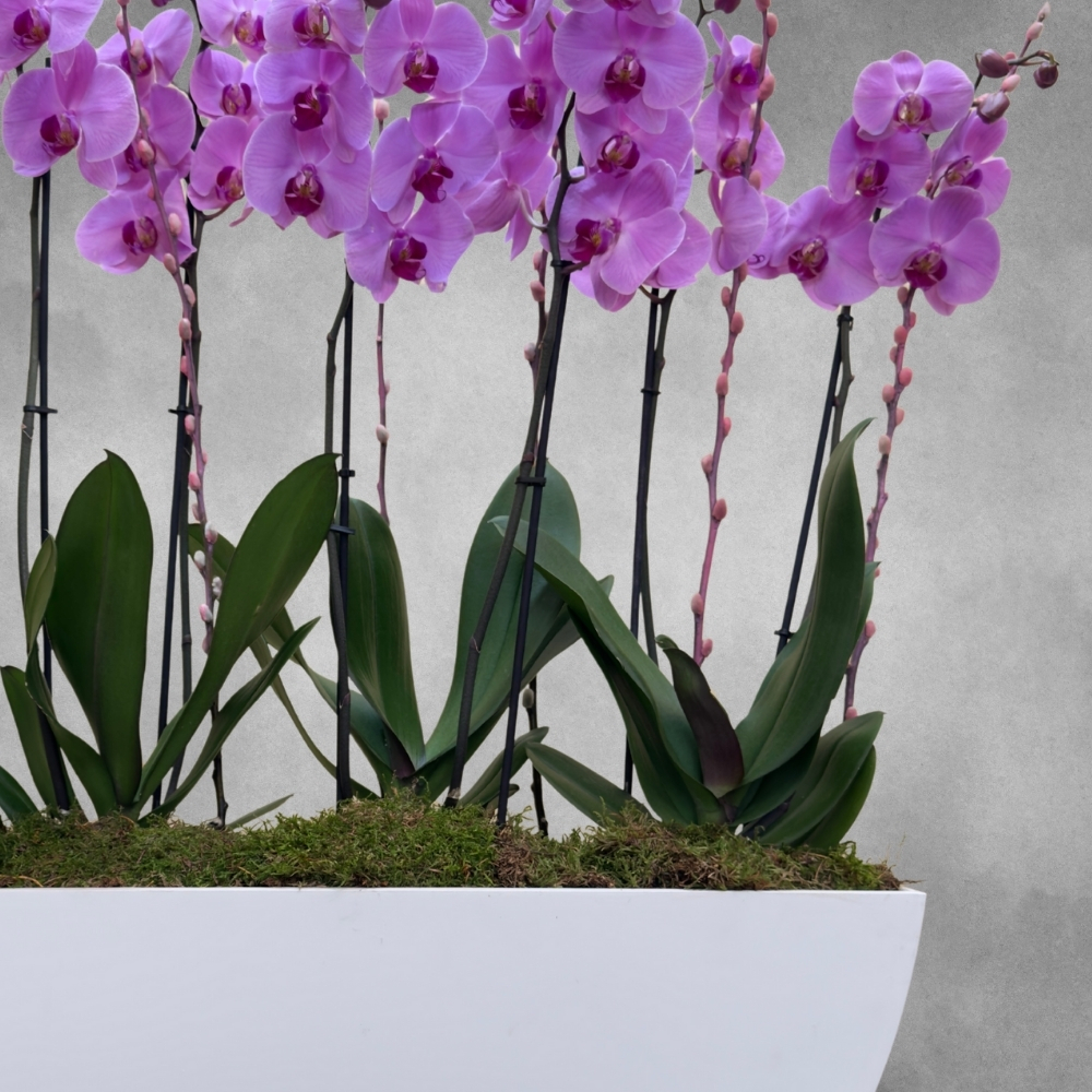 Pink phalaenopsis orchid plants, elegantly arranged in a white oval wooden pot. A delicate and stylish display, perfect for brightening any space.
