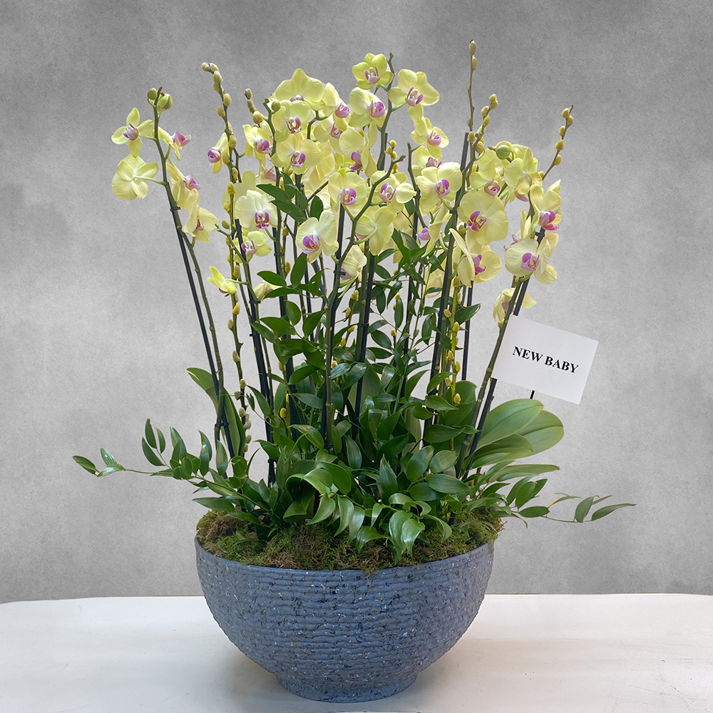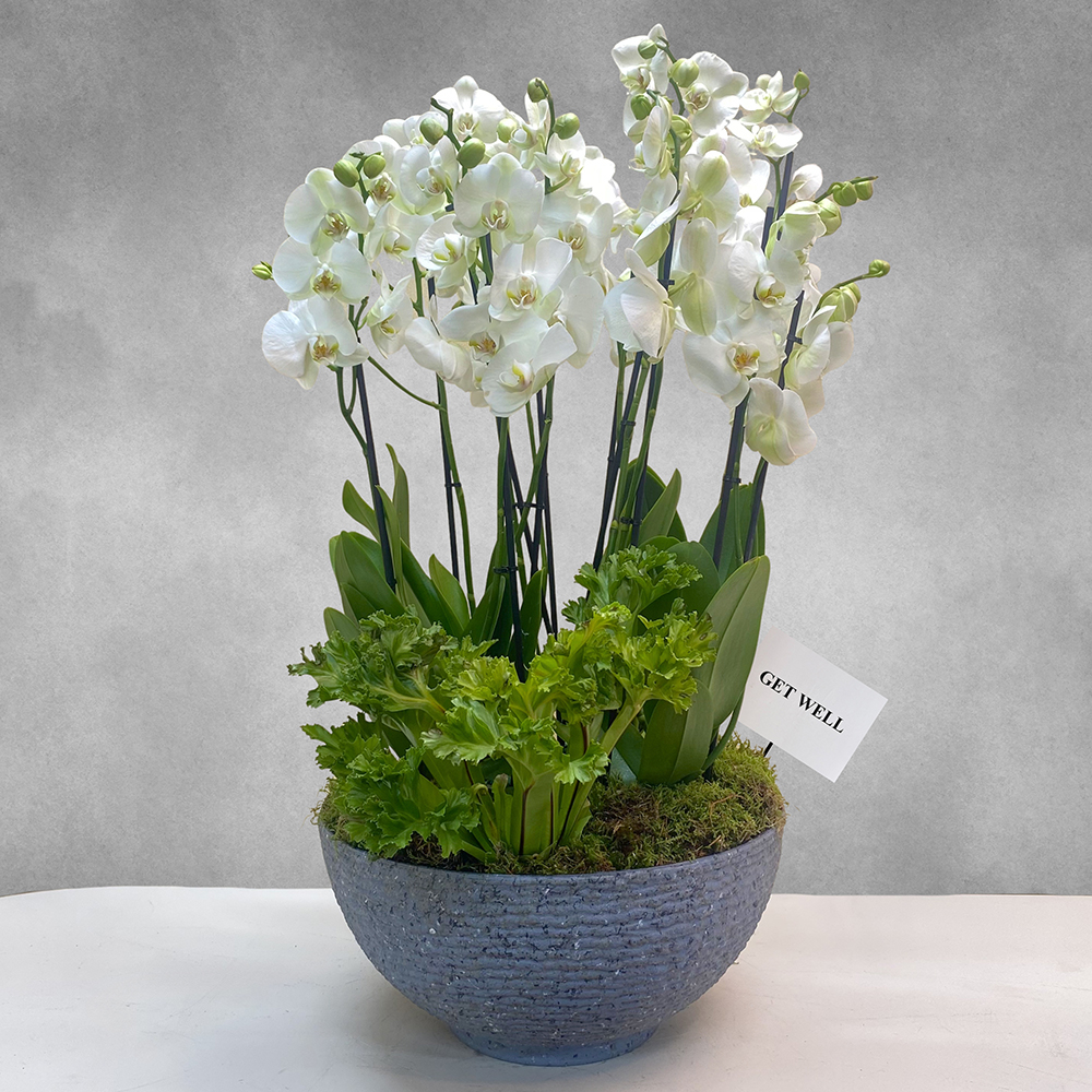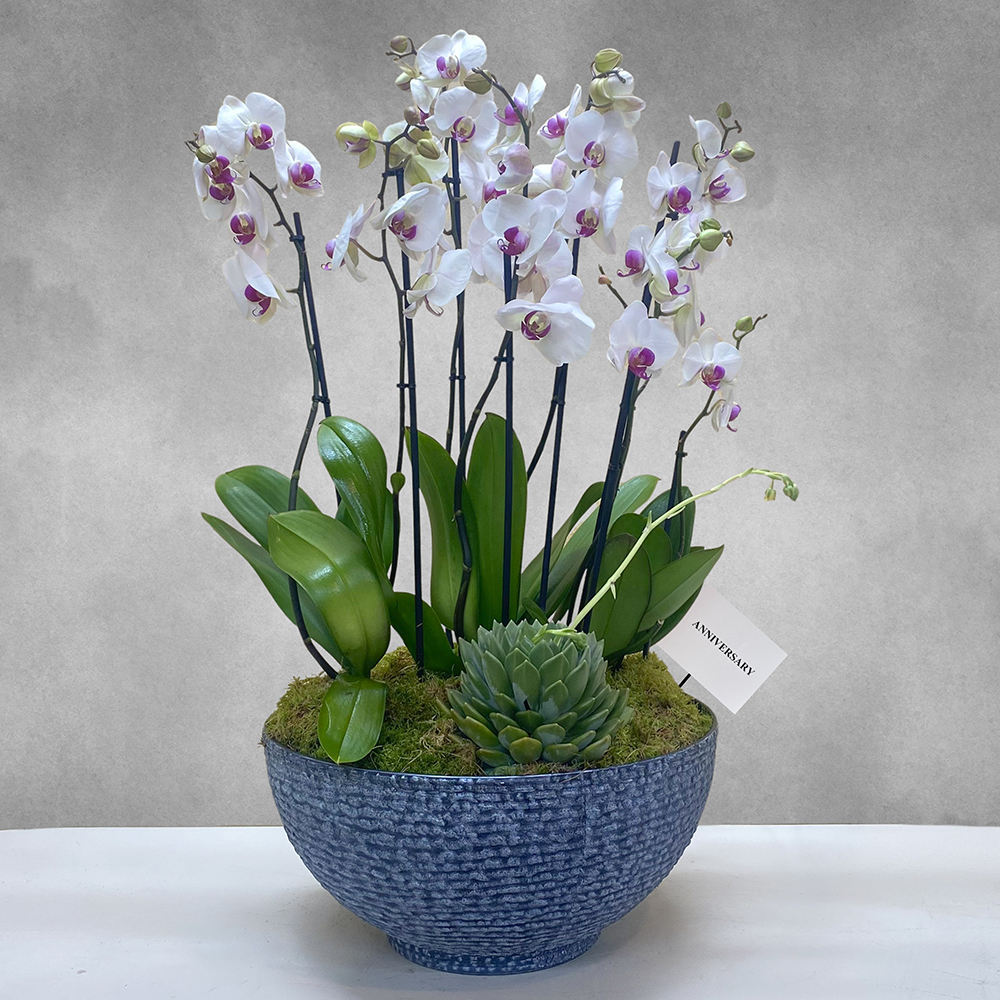 White orchid plants arranged in a black dotted pot with statice and echeveria.