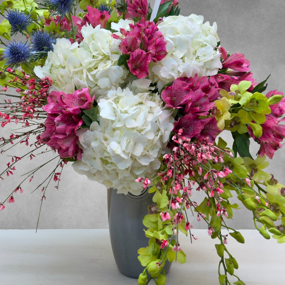Hydrangeas, alstroemeria, eryngium and mokara in a grey vase.