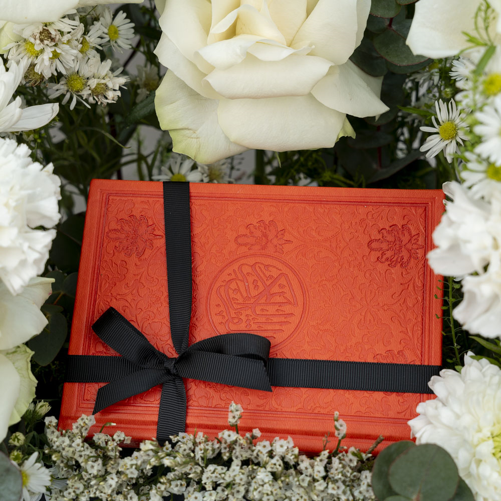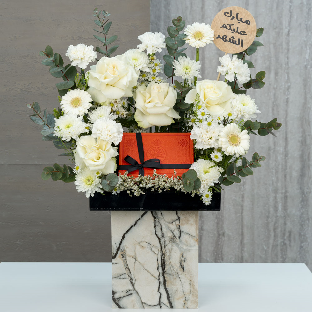 This bouquet contains gerberas, roses, carnations and chrysanthemums with a beautifully colored Quran.