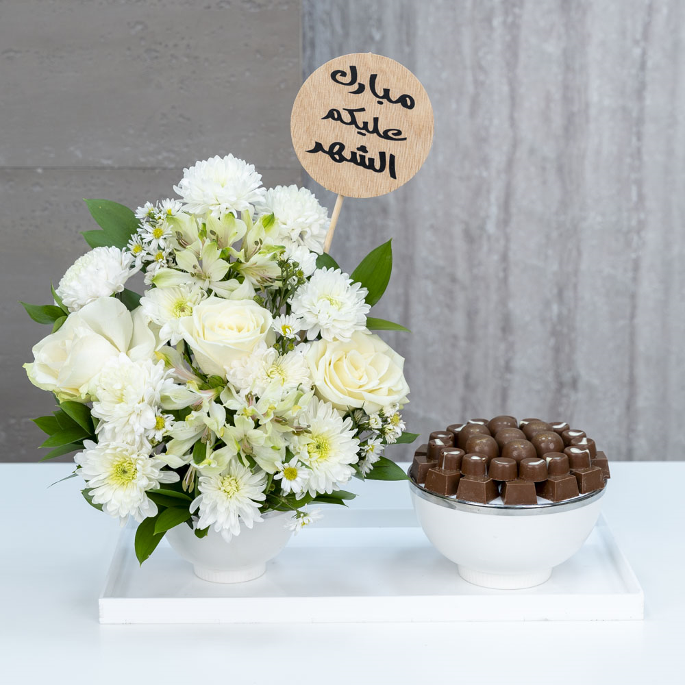 This bouquet contains Alstroemeria, Chrysanthemums and roses with chocolates.