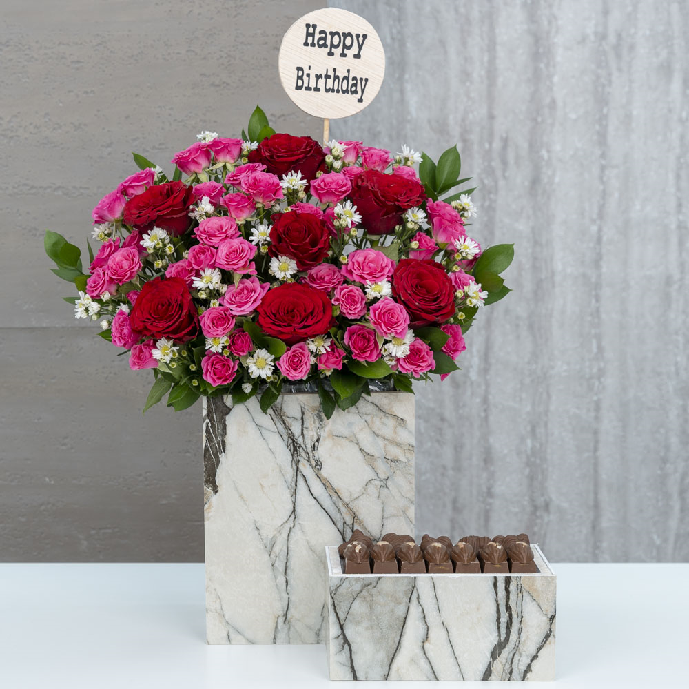 This bouquet contains baby roses with chocolates.