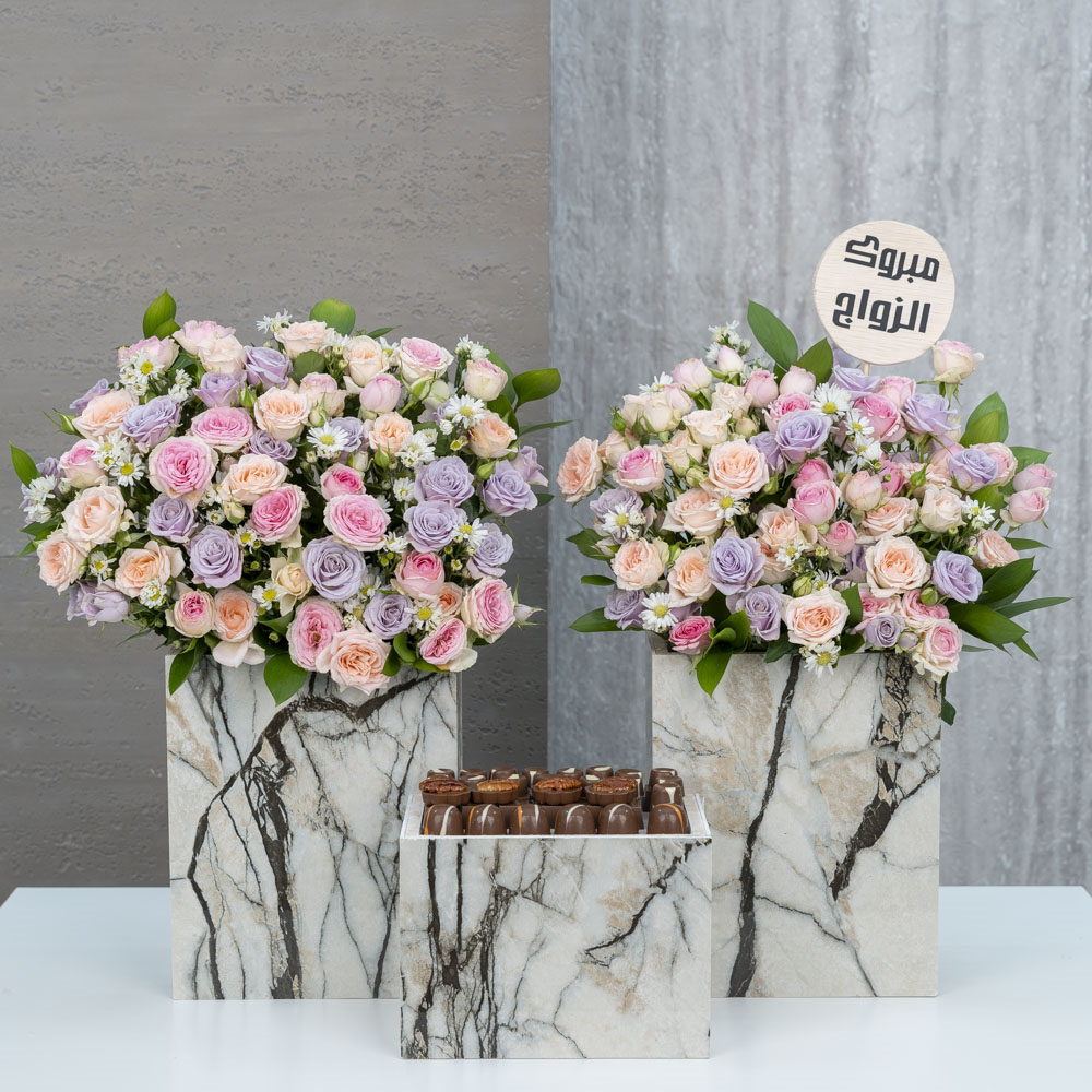 A set of 2 bouquets of roses and baby roses along with chocolates.