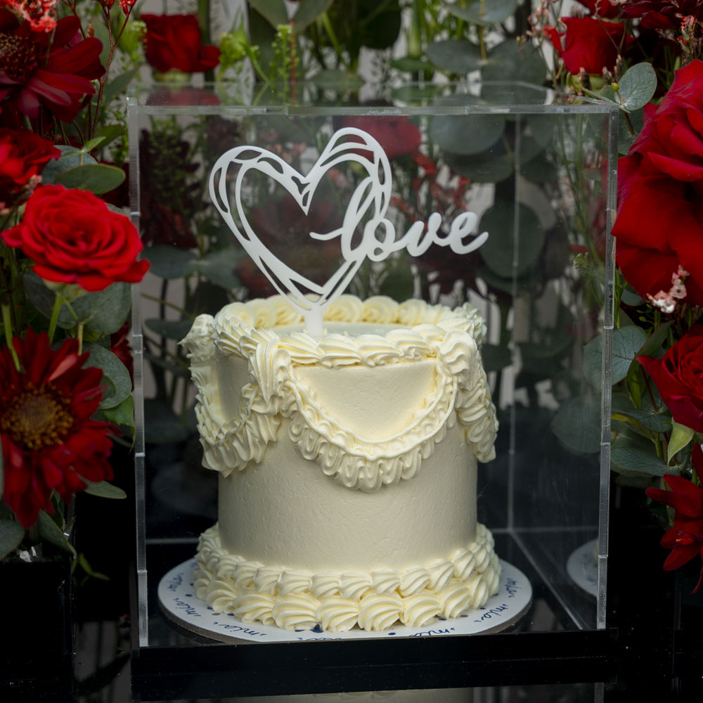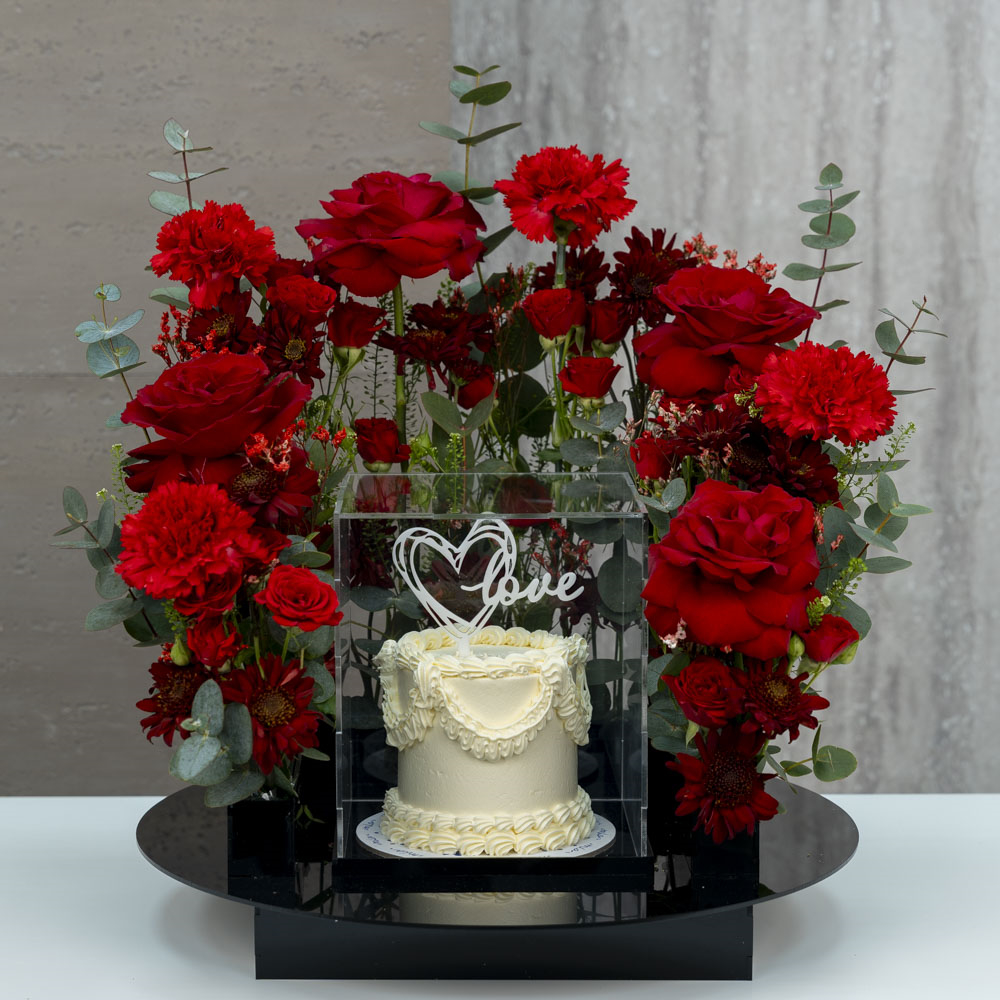 This bouquet contains roses, carnations and chrysanthemums with a chocolate cake.
