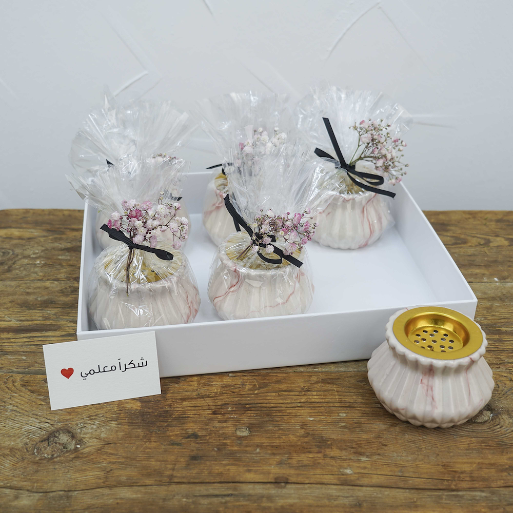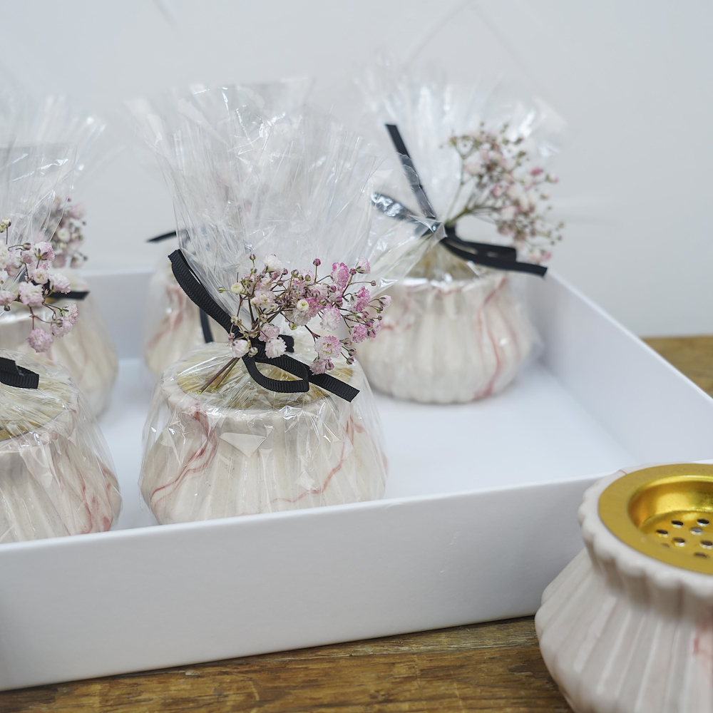 This bouquet contains gypsophila flowers with 6 incense burners for giveaways.