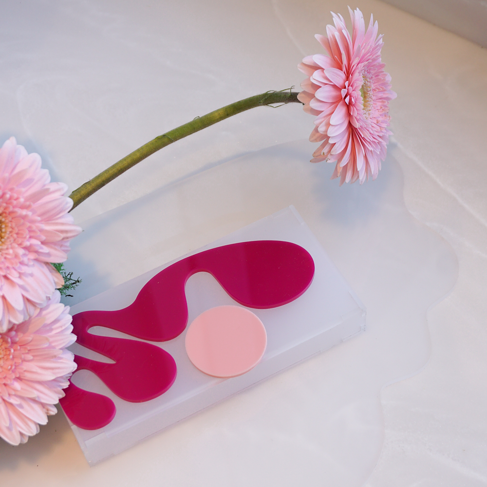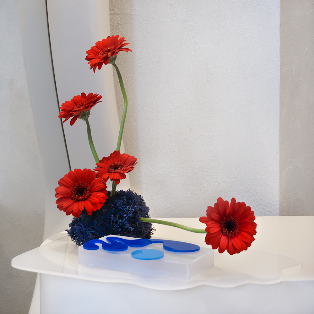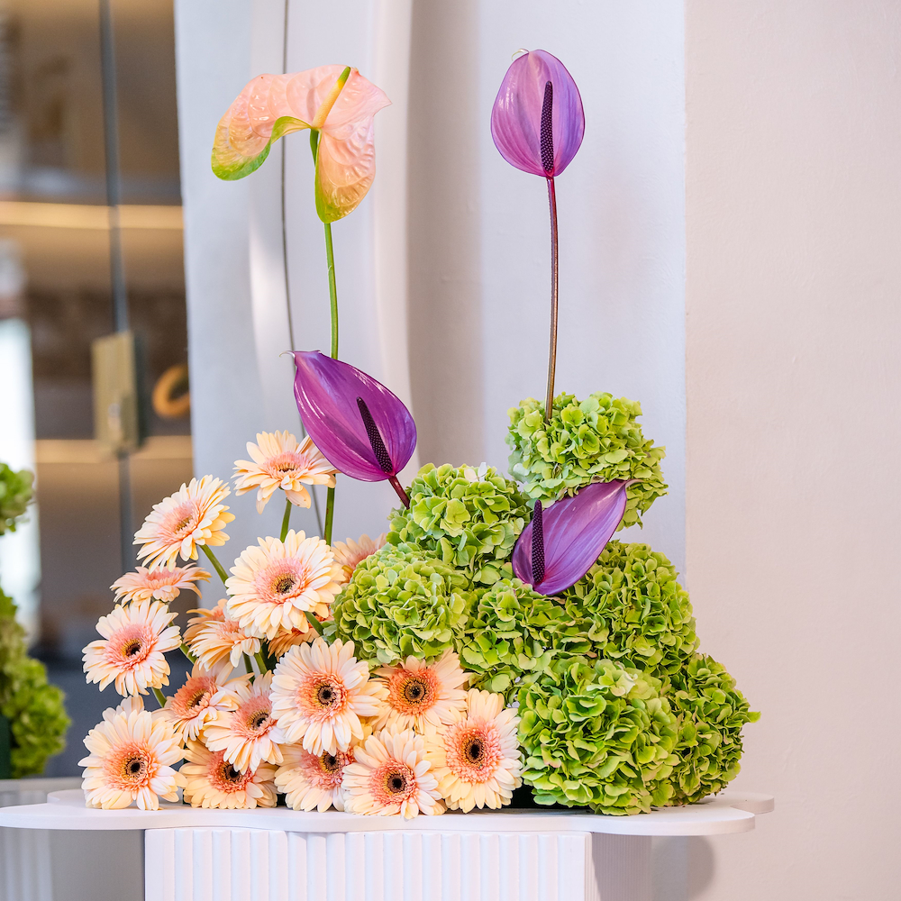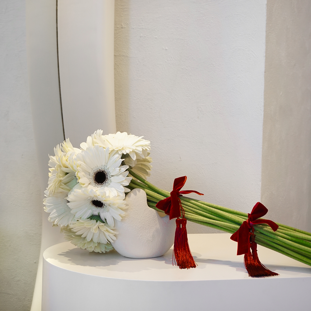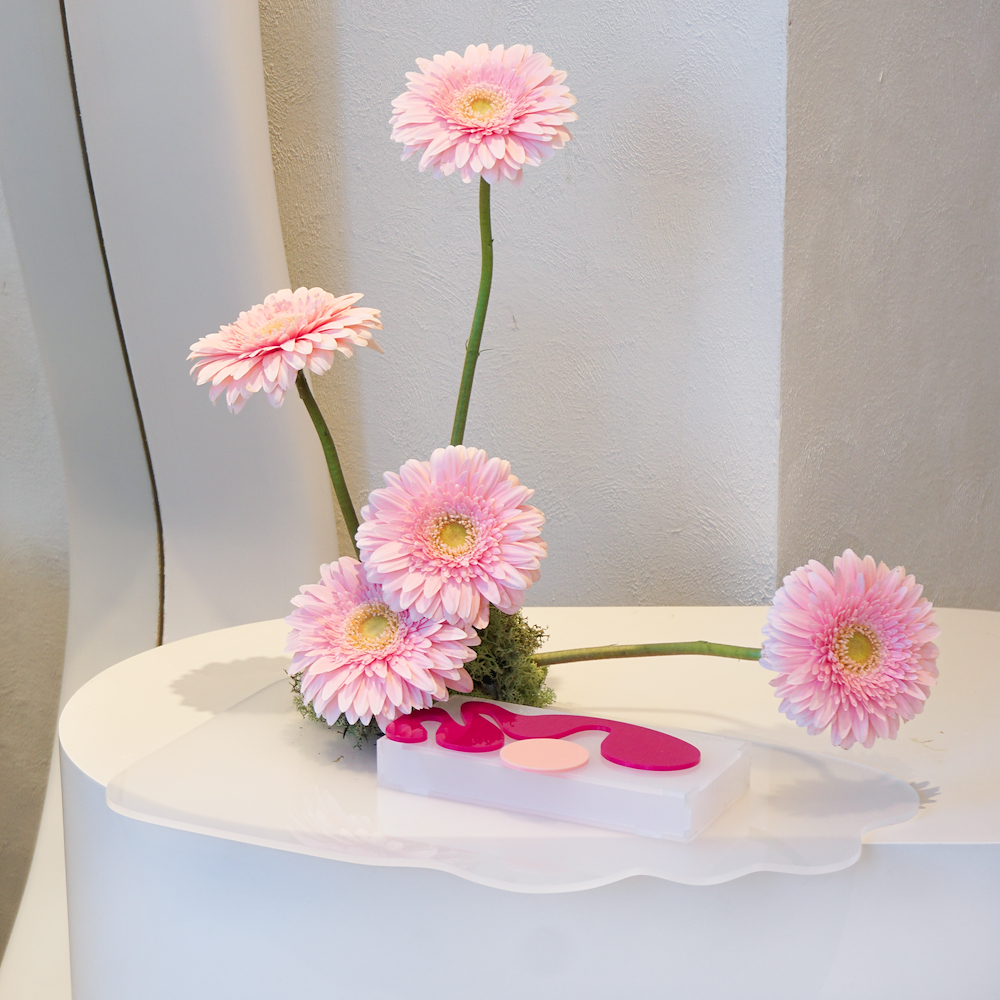 A trendy cash tray with a modern arrangement of gerbera flowers.