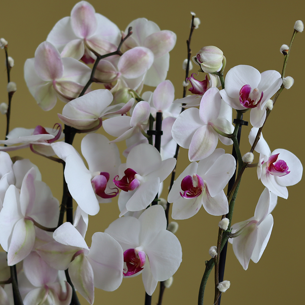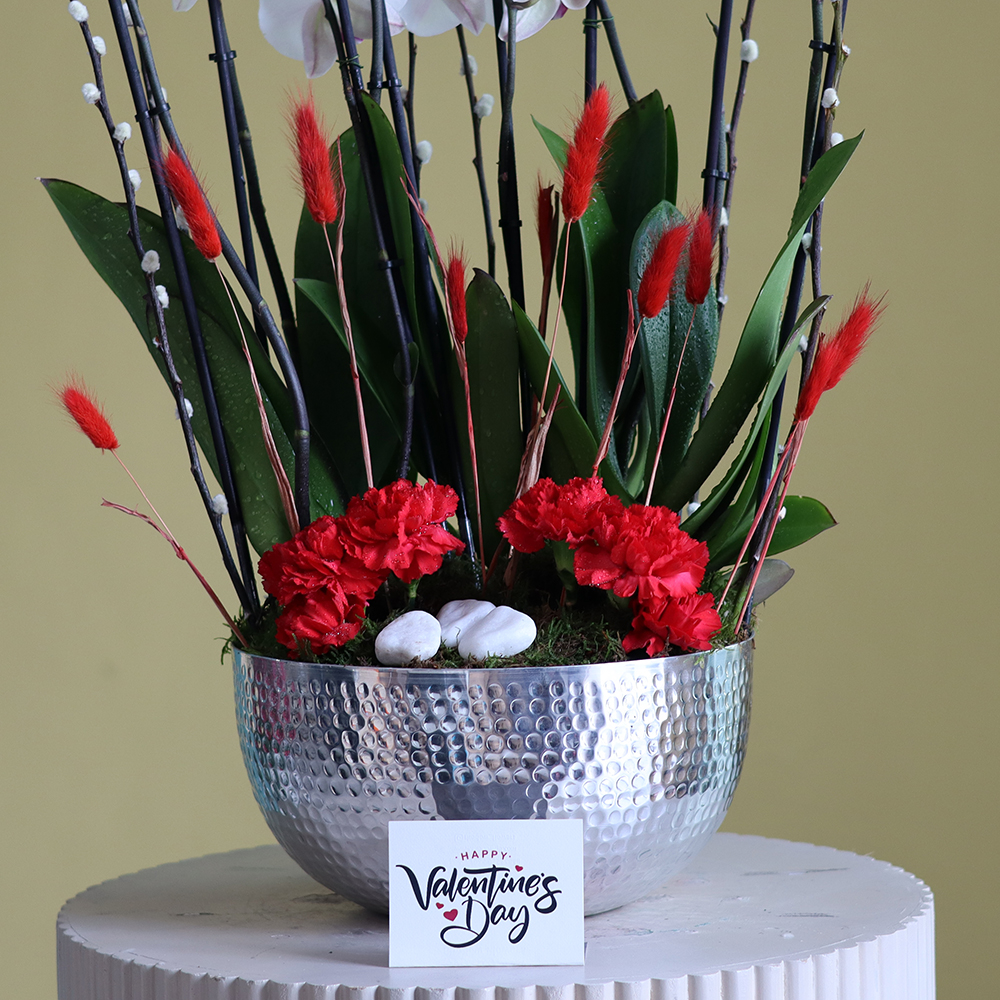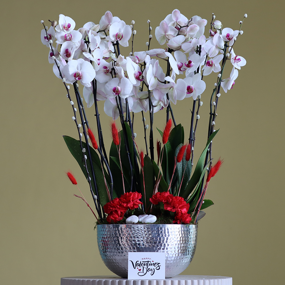 An elegant vase arranged with red lip orchid plants.