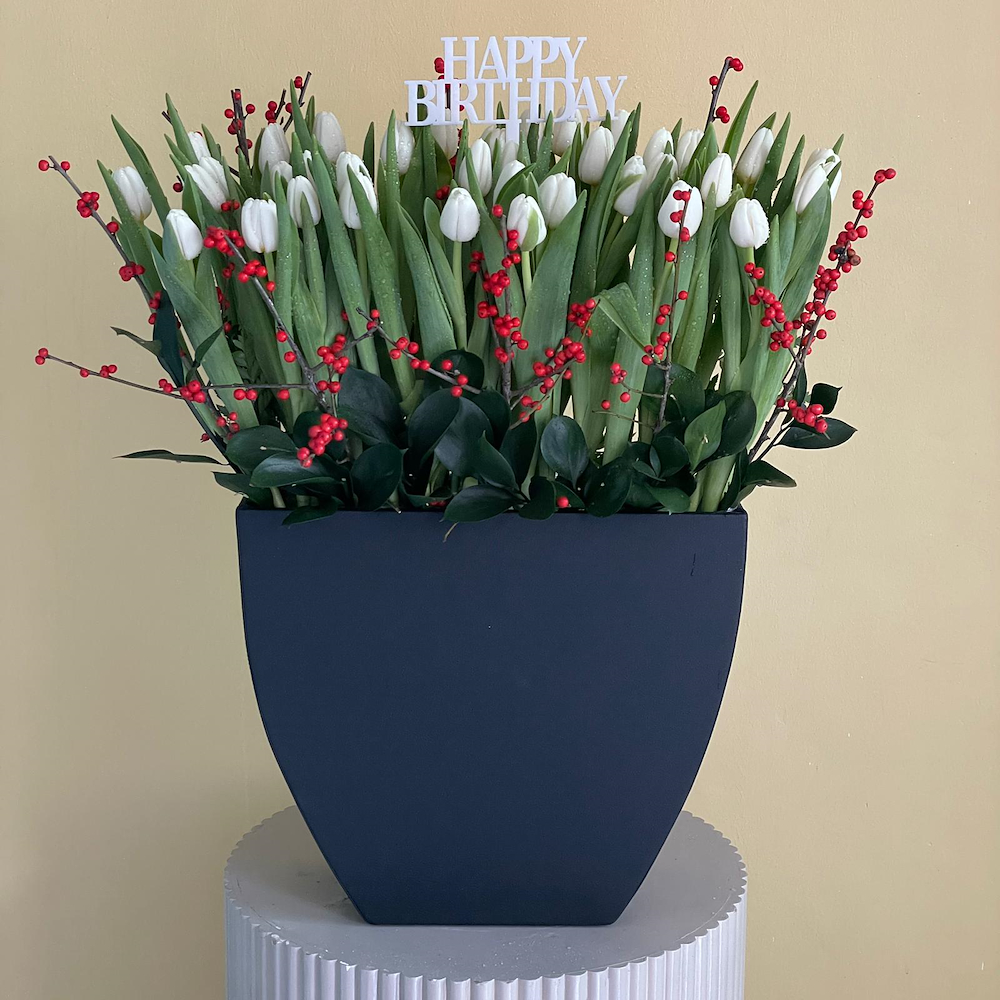 This beautiful arrangement contains delphiniums and hydrangea with green leaves in a vase.