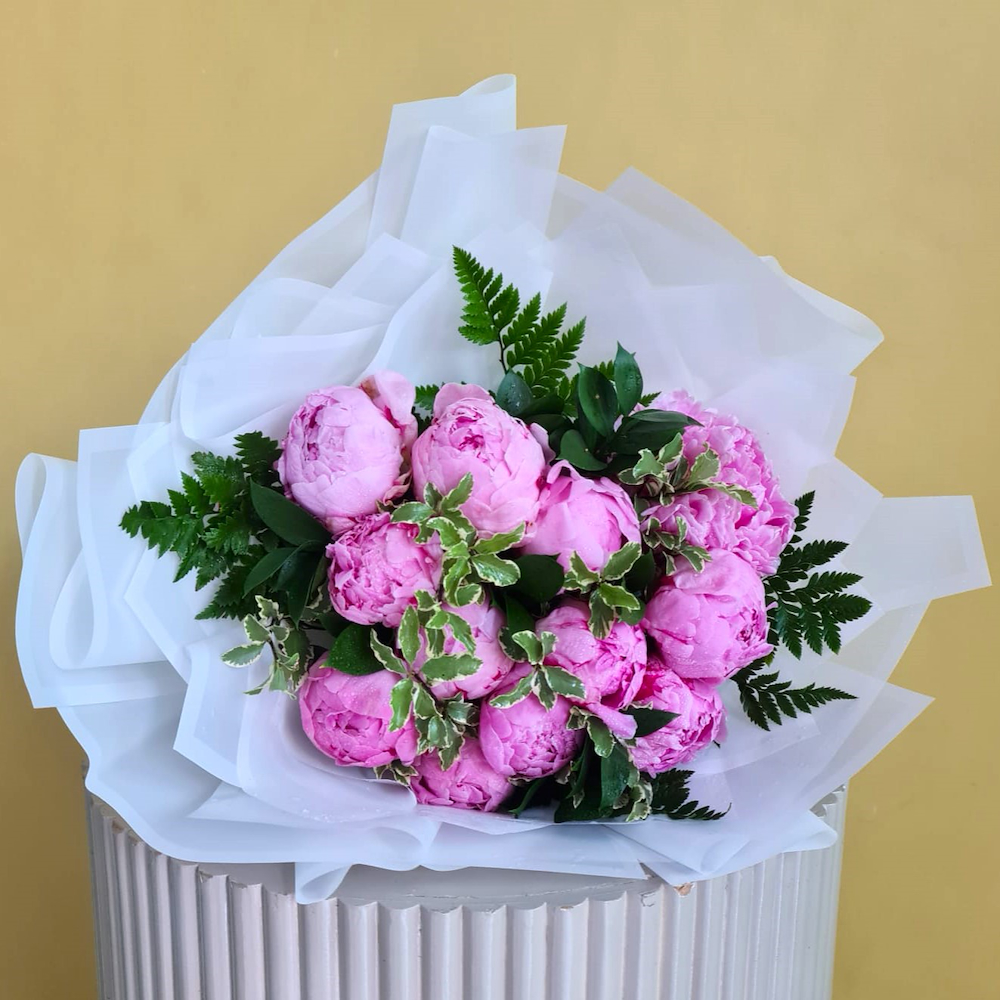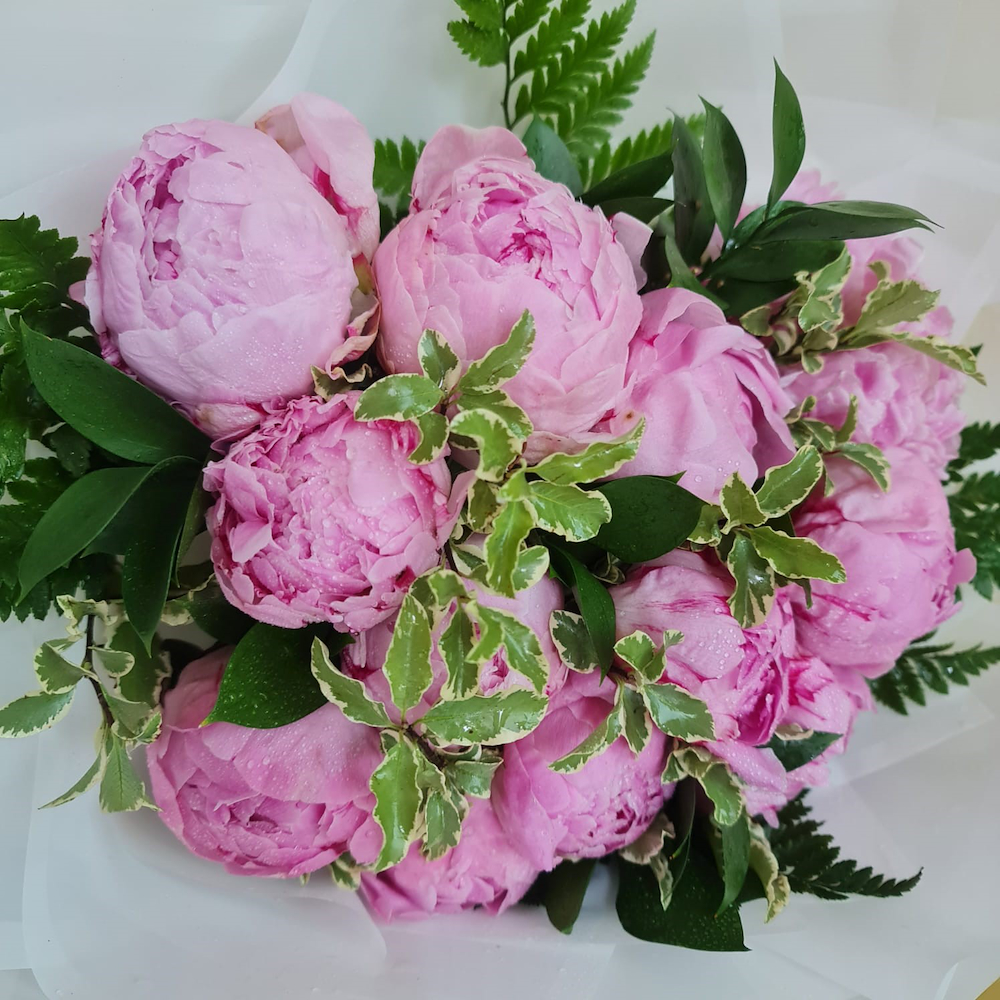 A hand-tied bouquet of peonies with greens, arranged beautifully.