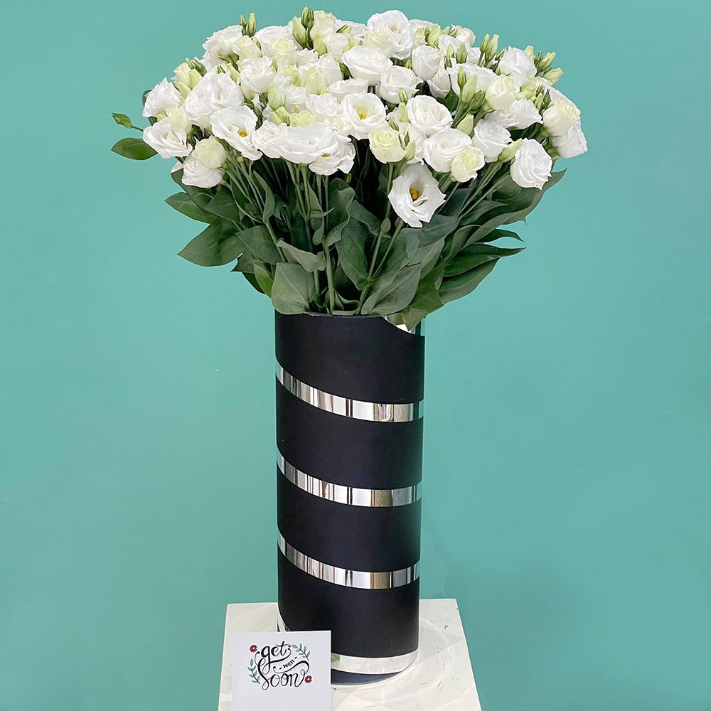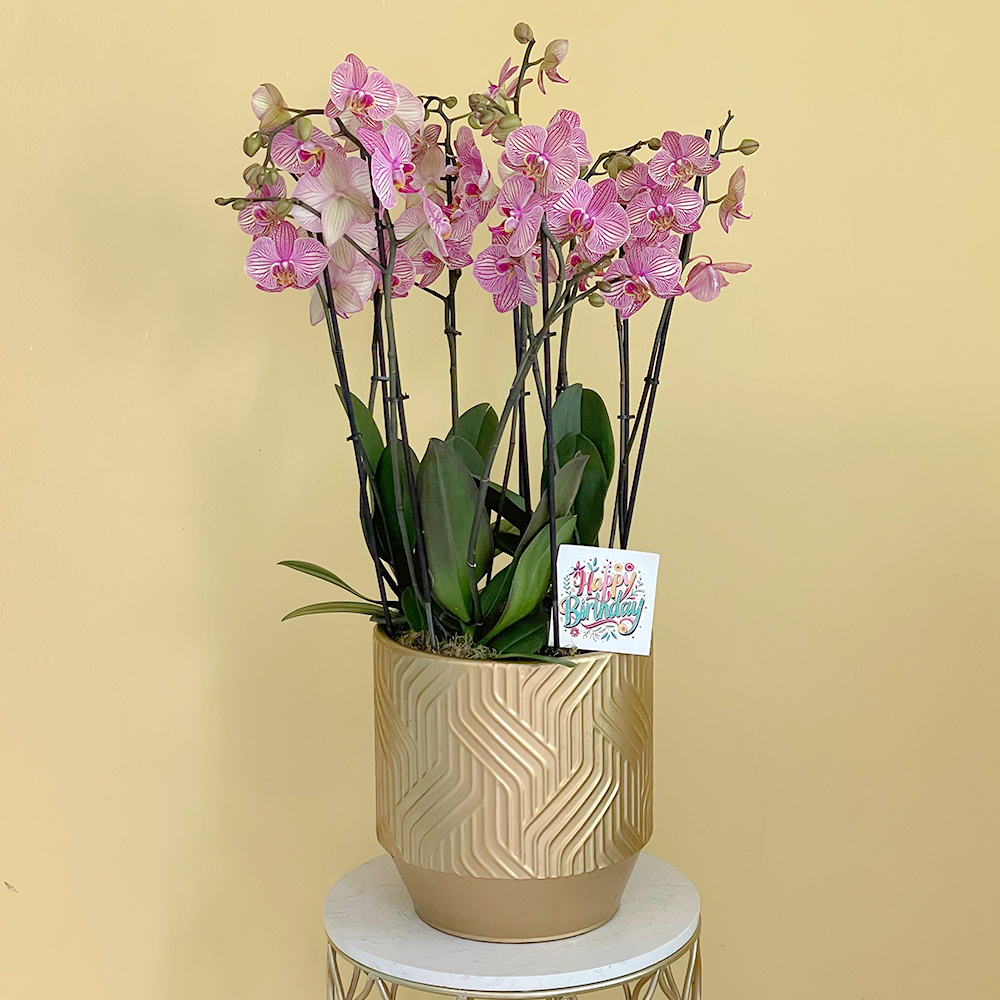 Pink orchid plants and cotton sticks arranged in a silver bowl vase.