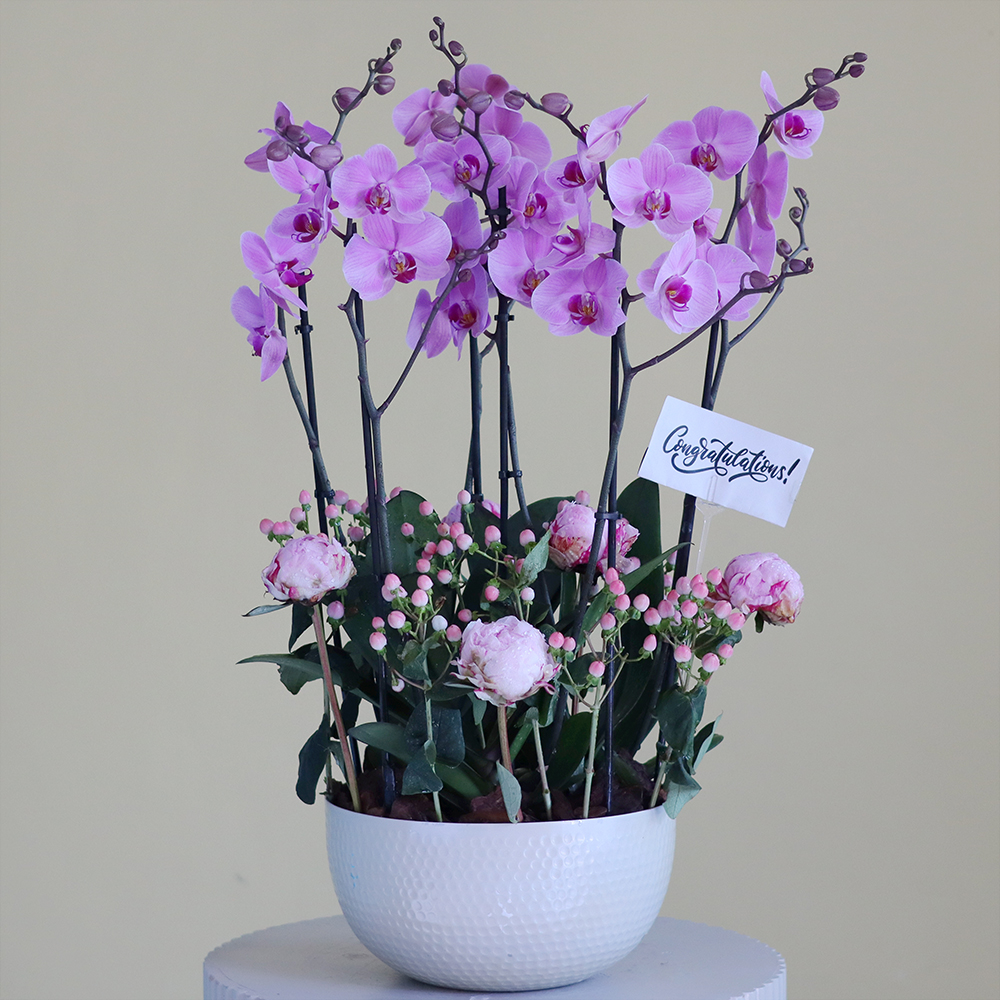 Beautiful soft pink orchid plants arranged with echeveria and cotton sticks, arranged in a white vase.