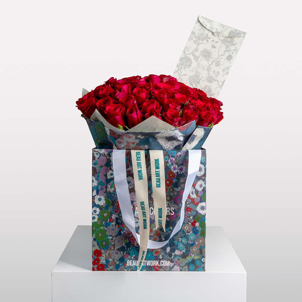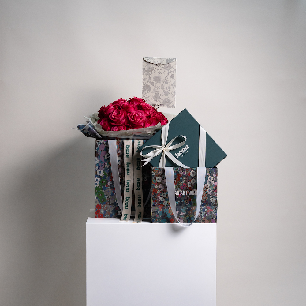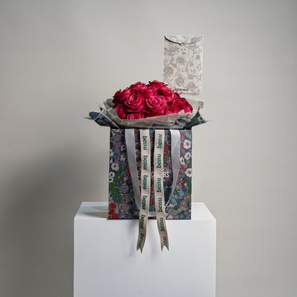 A luxurious bouquet featuring fuchsia roses with Piemont chocolate by Chef Muneera Al Hubaish.