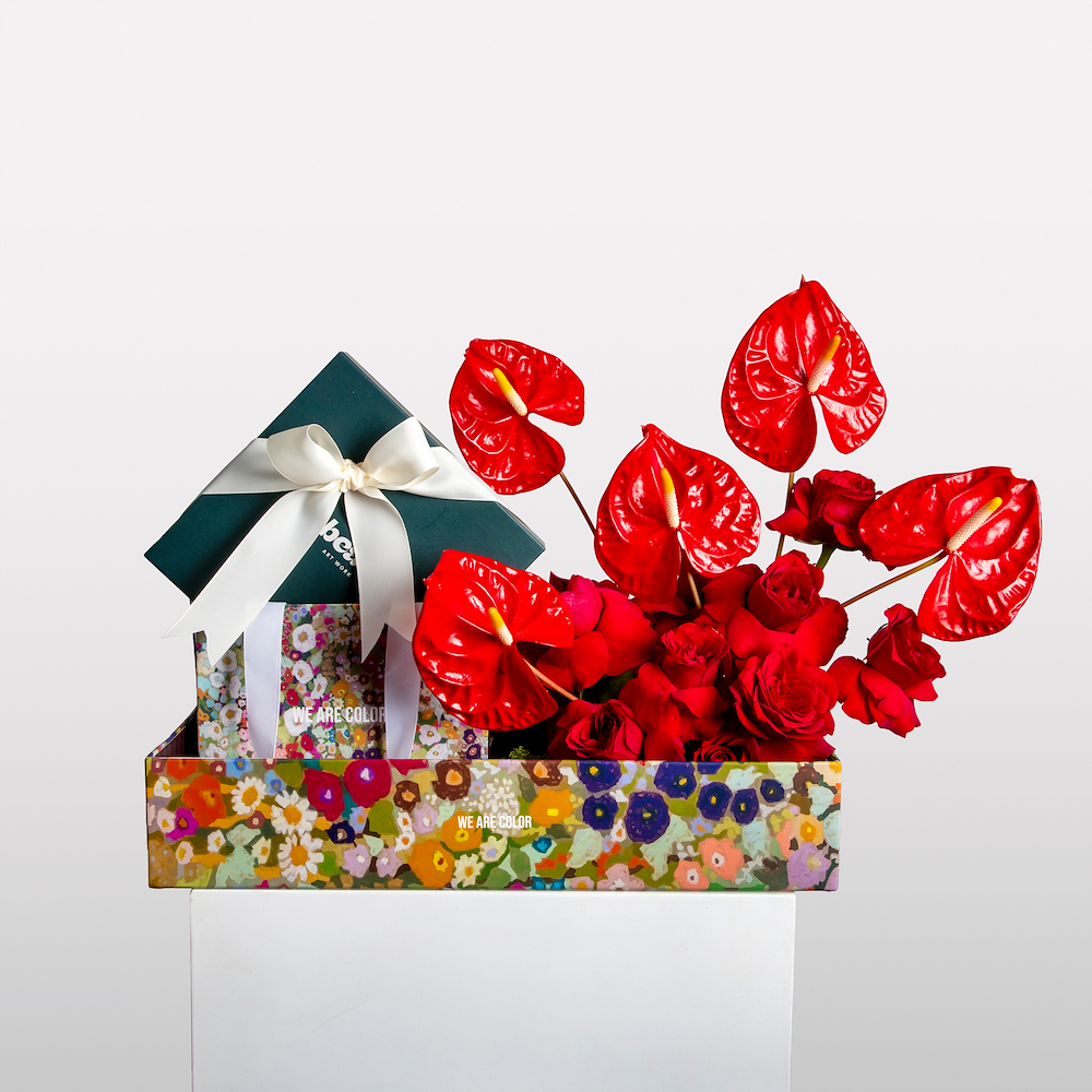 A red floral arrangement of roses and anthuriums, presented in an open tray. Comes with a chocolate box from Kuwaiti chef Muneera Alhubesh - Piemont chocolate.