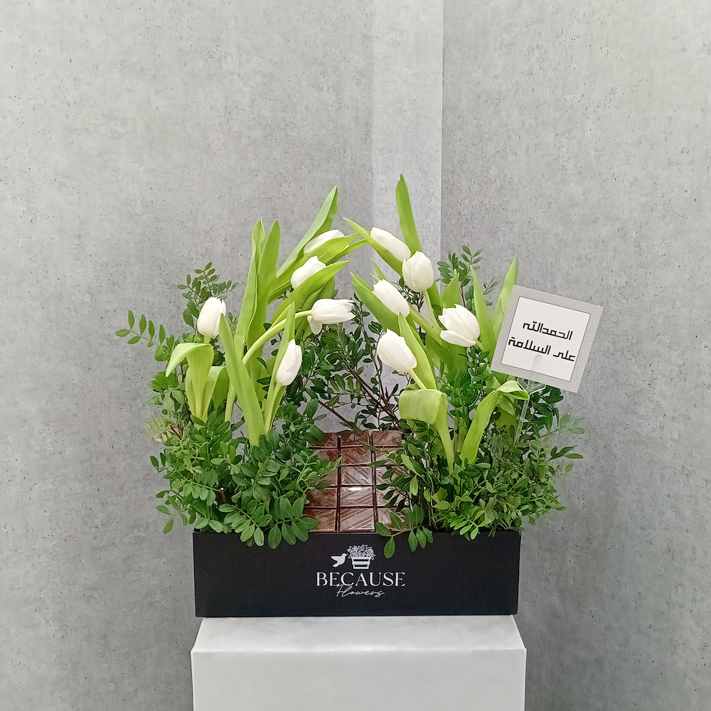 A box that contains tulips and pistachio leaves along with chocolates.