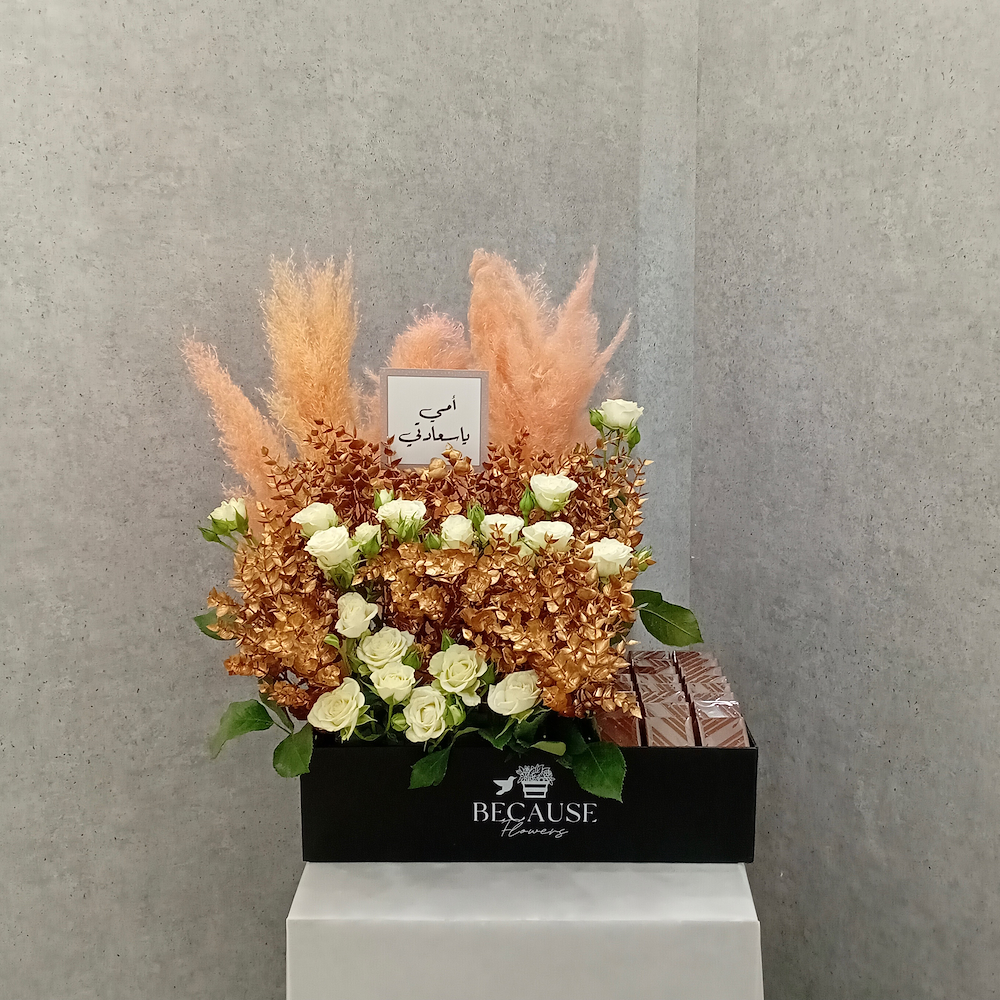 This beautiful bouquet contains Eustoma and chocolates.