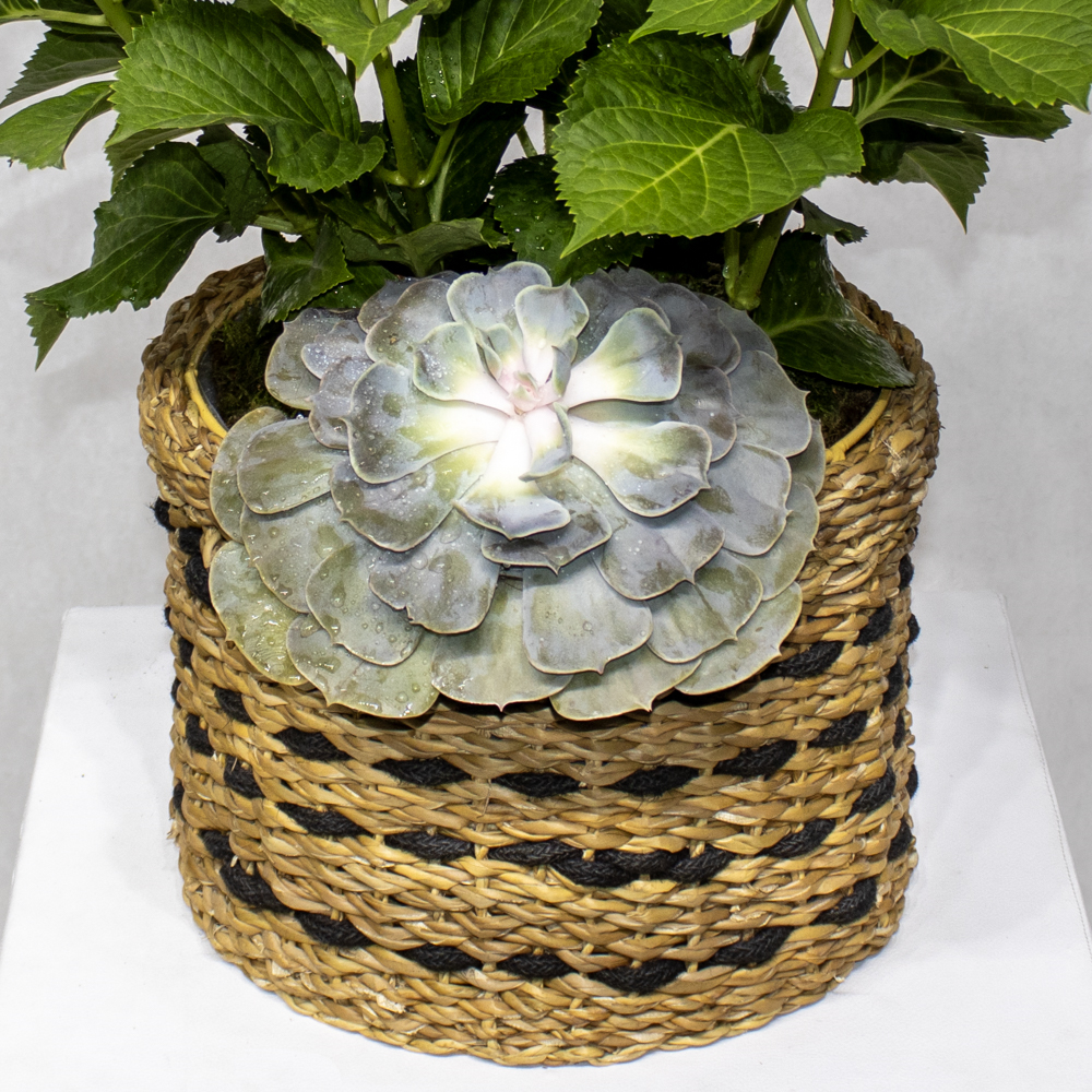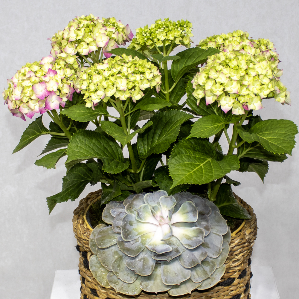 A bouquet containing pink and green hydrangeas, arranged beautifully in a handmade vase.