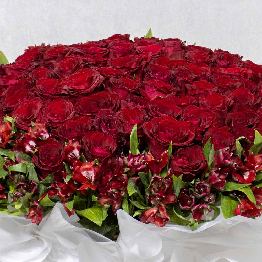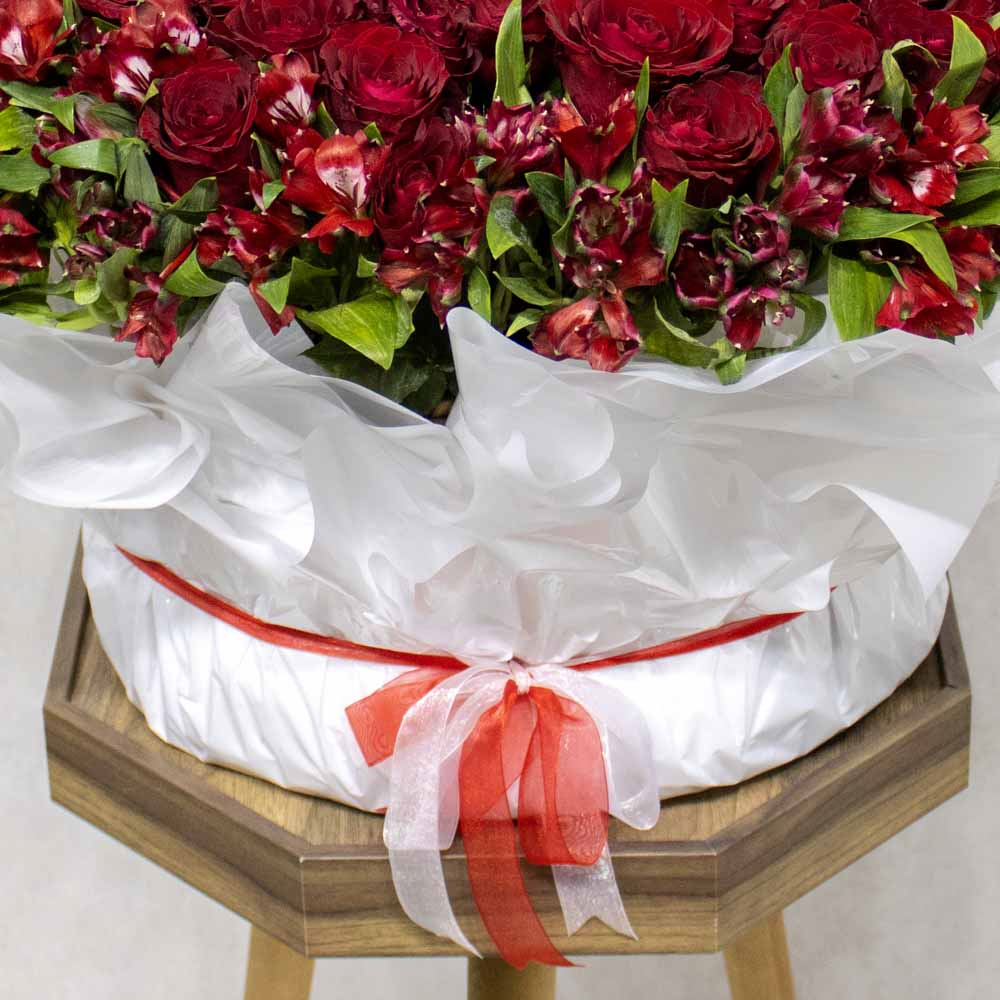 An arrangement of red roses and alstroemerias red in a paper wrapping vase.
