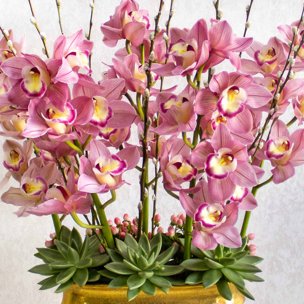 A vase filled with cymbidium, hypericum, cotton stick and echeveria plants.