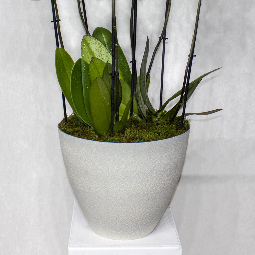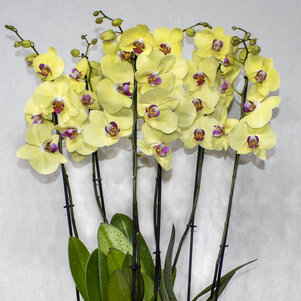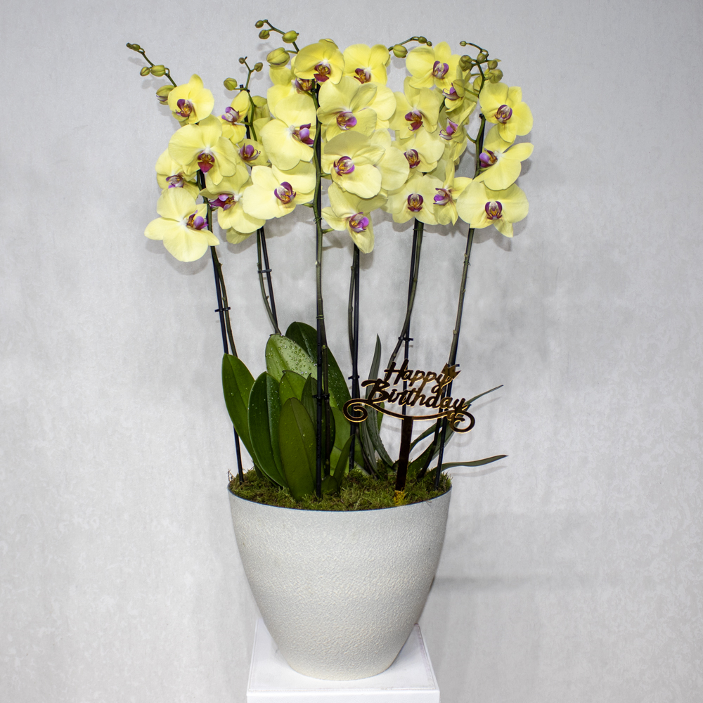This bouquet contain yellow orchid plants, beautifully arranged in fiber vase.