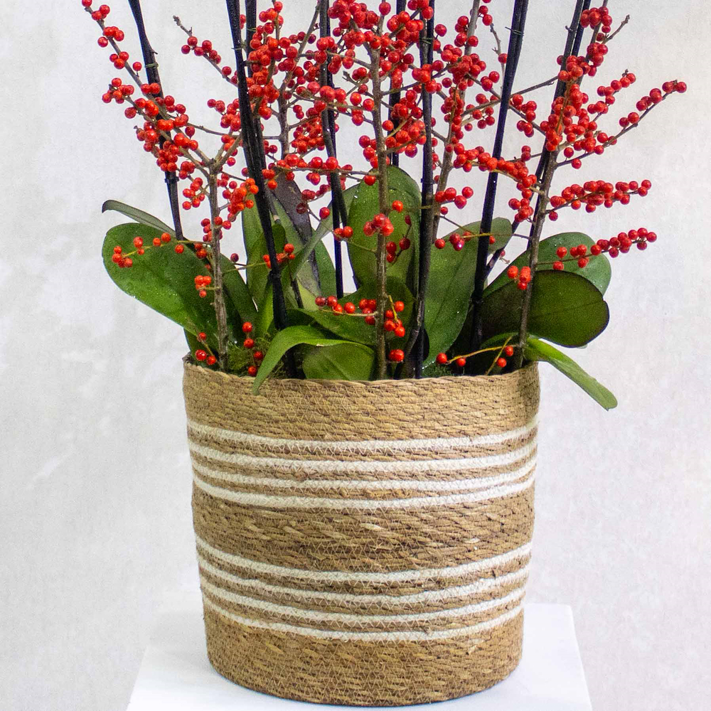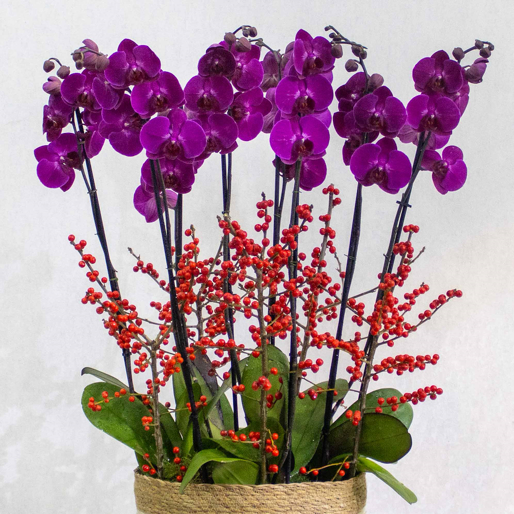 A basket filled with purple orchid plants and ilex sticks.