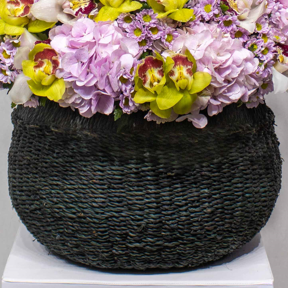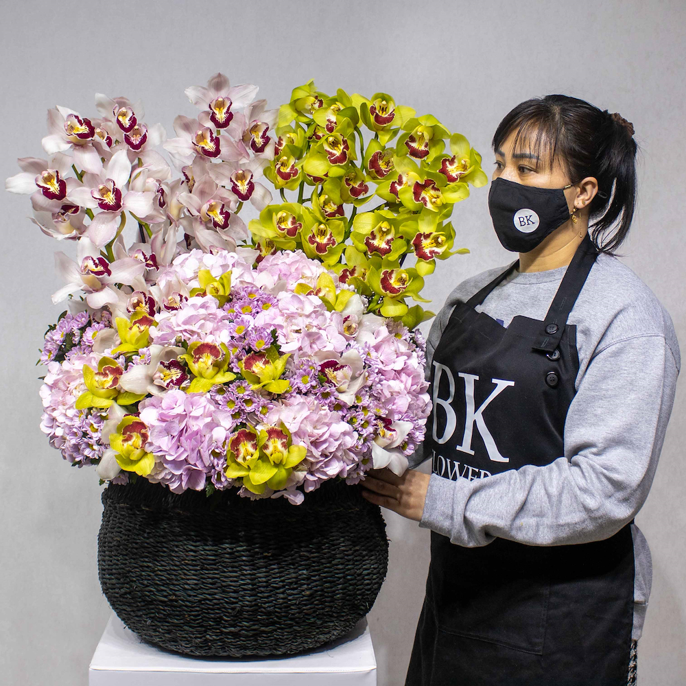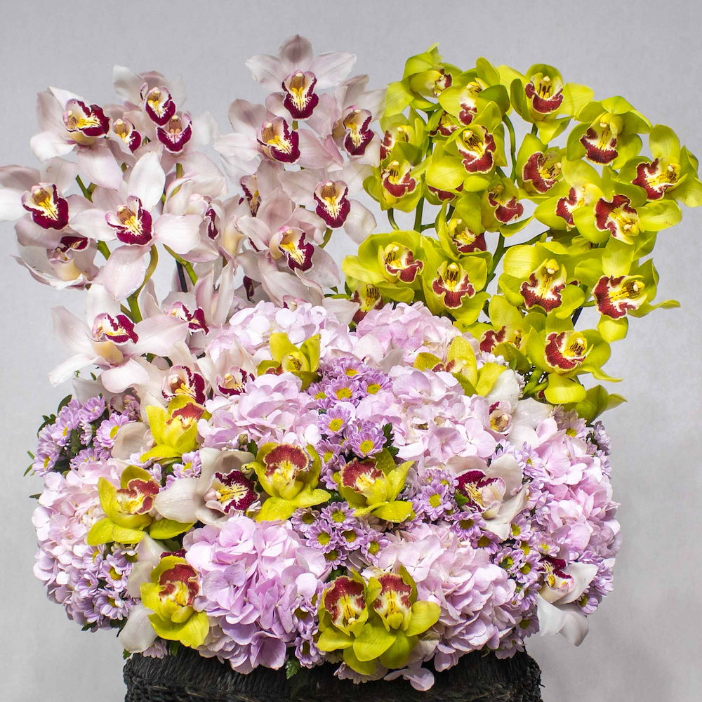 A bouquet that contains cymbidiums, hydrangeas, and chrysanthemums.