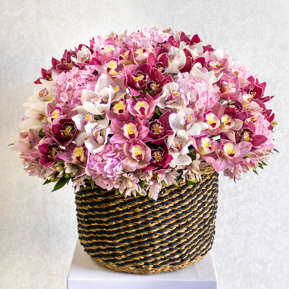 This bouquet contains 450 stem, 2700 pcs pink baby roses beautifully arranged in a ceramic vase.