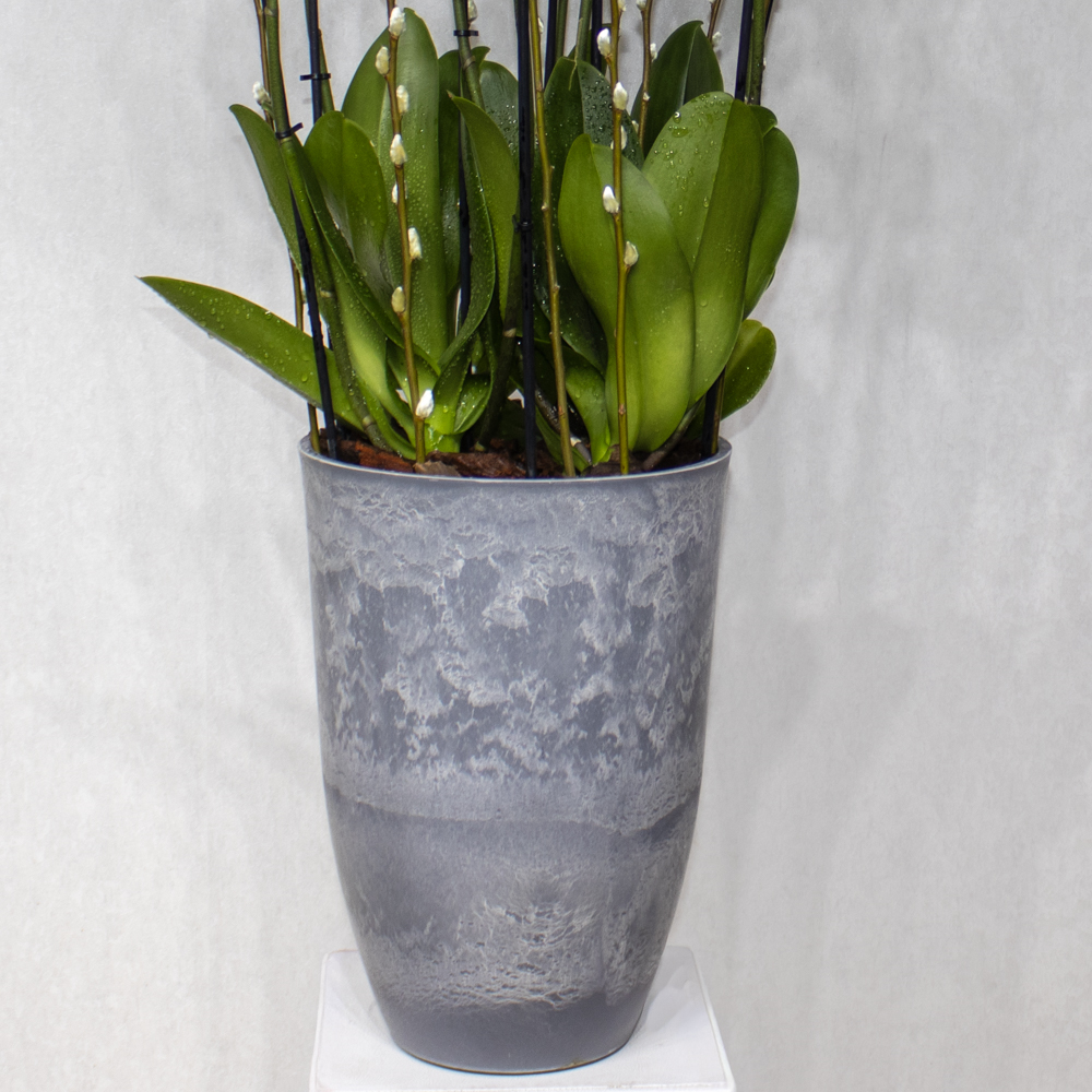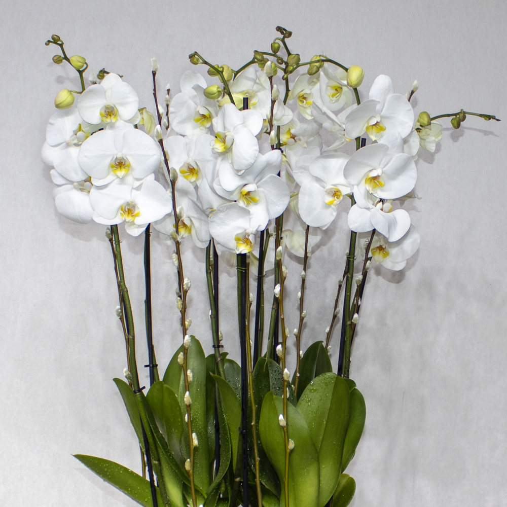 This bouquet contains white orchid plants, beautifully arranged in a high vase.
