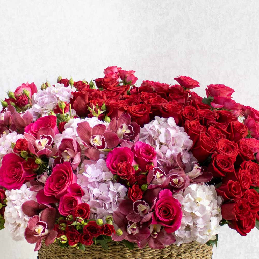 A handmade vase filled with red & pink roses, hydrangea pink, cymbidium, hypericum and baby roses.